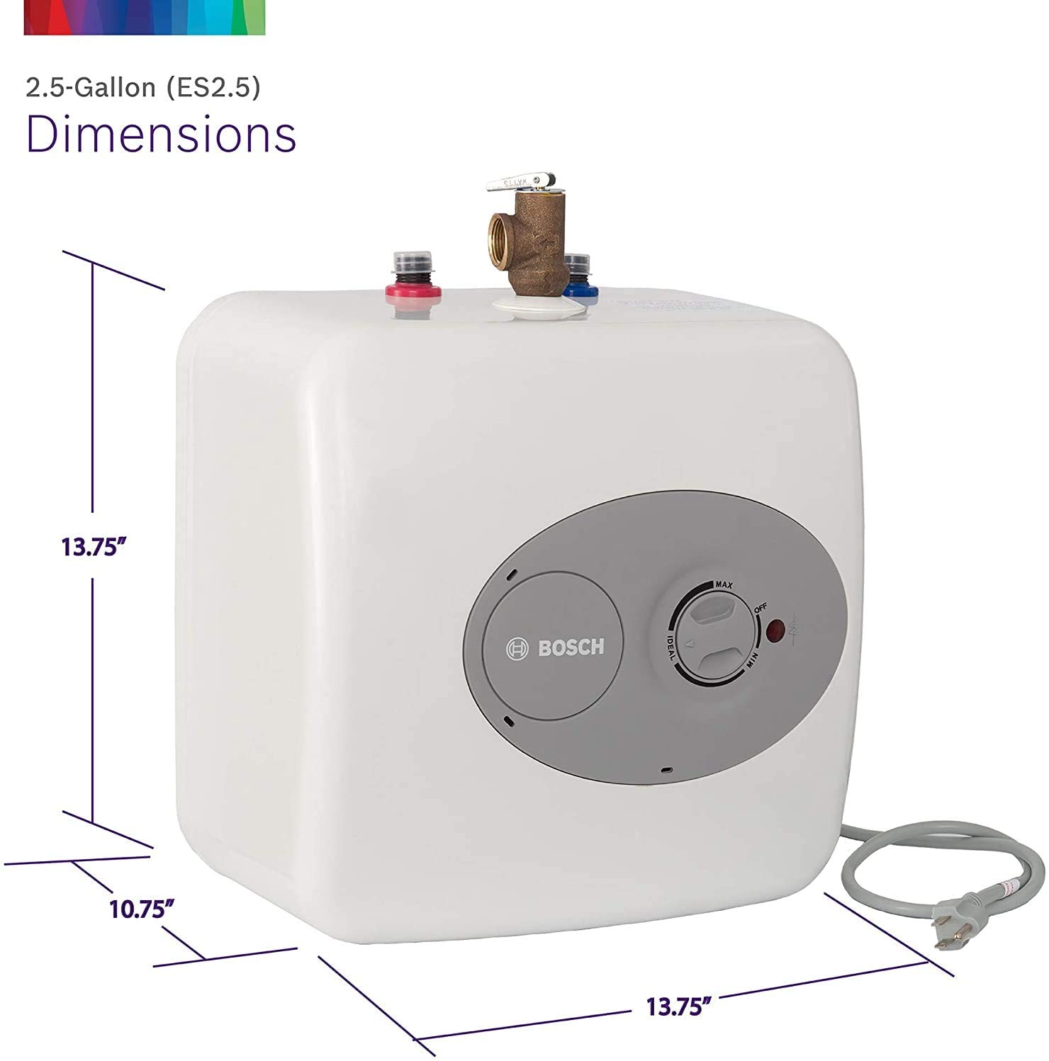 - CONVENIENT HOT WATER HEATER: 2.5 gallon point-of-use mini-tank fits under your sink to provide hot water right where you need it. Thermal efficiency is 98%. Dimensions : 13.75 W x 13.75 H x 10.75 D Inches