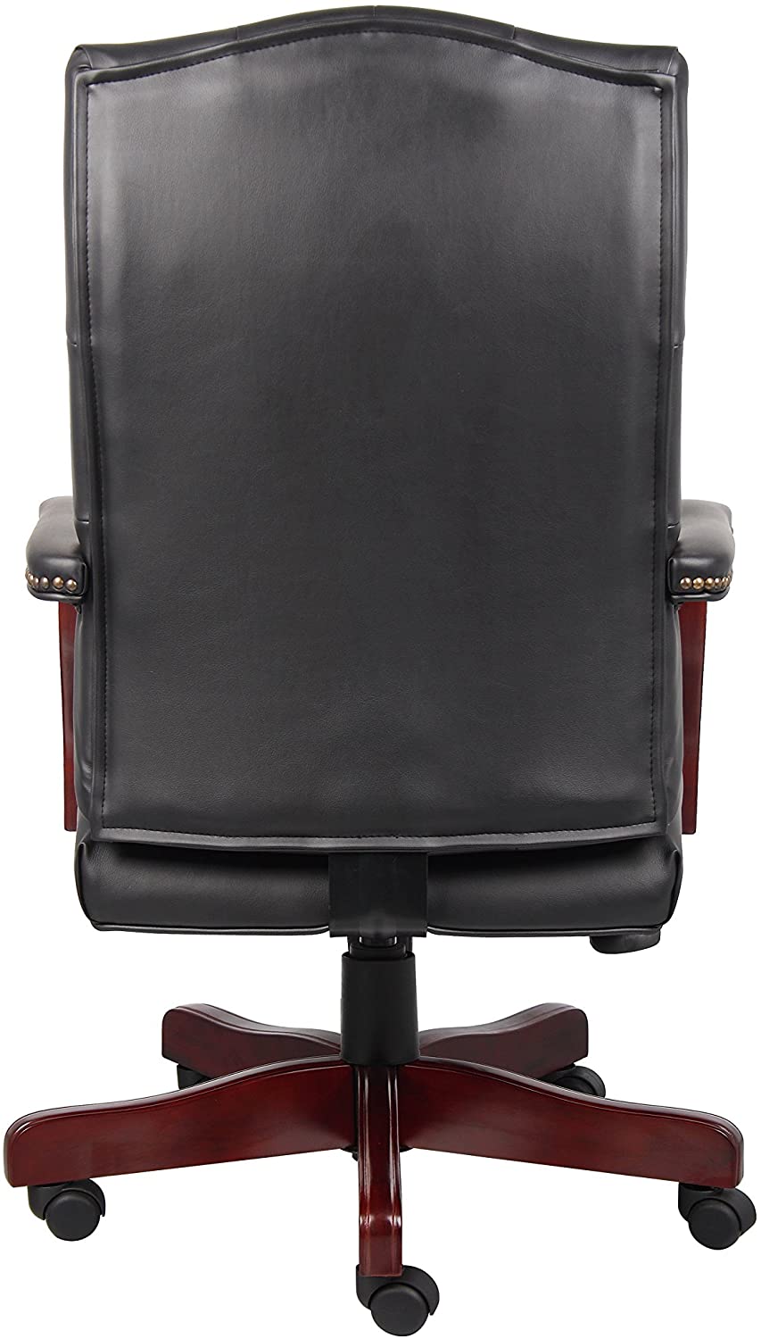 The Boss Classic Black Caressoft Chair With Mahogany Finish by Boss Office Products features five wheels for quickly moving around the office to complete a variety of tasks. The unit measures 27" W x 28" D x 43-46.5" H, where the height can be adjusted to suit your needs. The chair stuns in its classic button tufted styling and beautiful hand applied brass nail head trim. The wood frame is sturdy to provide a long life. Each of these chairs weighs 60 pounds and are able to hold 275 pounds. This unit also matches chair model B959, which is great when adding enough furniture to outfit an office.