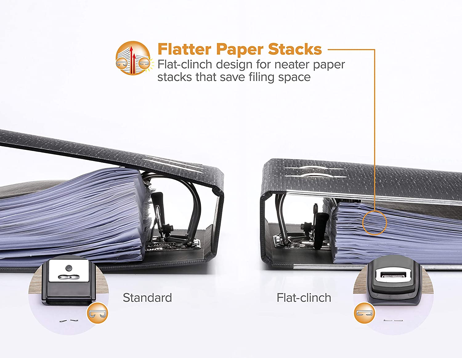 • Flat clinch design for flatter and neater paper stacks