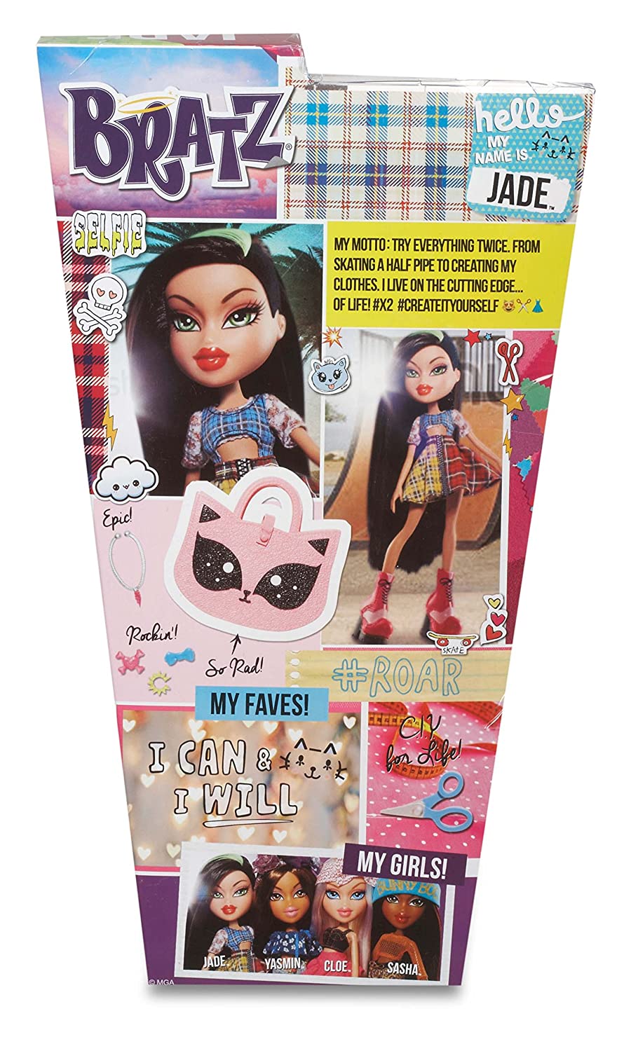 Introducing Bratz, the best-friends-for-life who inspire each other to design and create the world around them. Jade is a fearless trailblazer, always chasing the next big adventure. Her style is bold and unexpected, just like her personality - she loves to mix and match prints, textures and colors to create her own unique pieces. Doll Features: • Jade's "Plaid Meets Punk" style is all about mixing and matching unexpected patterns, colors and pieces • Her dress features 3 different plaid patterns in 3 different colors, with a zipper down the middle of her skirt • The cats on her patterned sleeves are a nod to her spirit animal, Cat • Her earrings, lightning bolt necklace, hair barrettes, and bracelet all fit inside her pink translucent kool kat tote • Comes with 8 accessories including her favorite pair of fabric scissors (for impromptu CIY fashion projects), and the iconic Bratz hairbrush in electric pink • Collect all 6 Bratz dolls from the Hello My Name Is Series - Cloe , Yasmin, Jade , Sasha , Raya , and Cameron