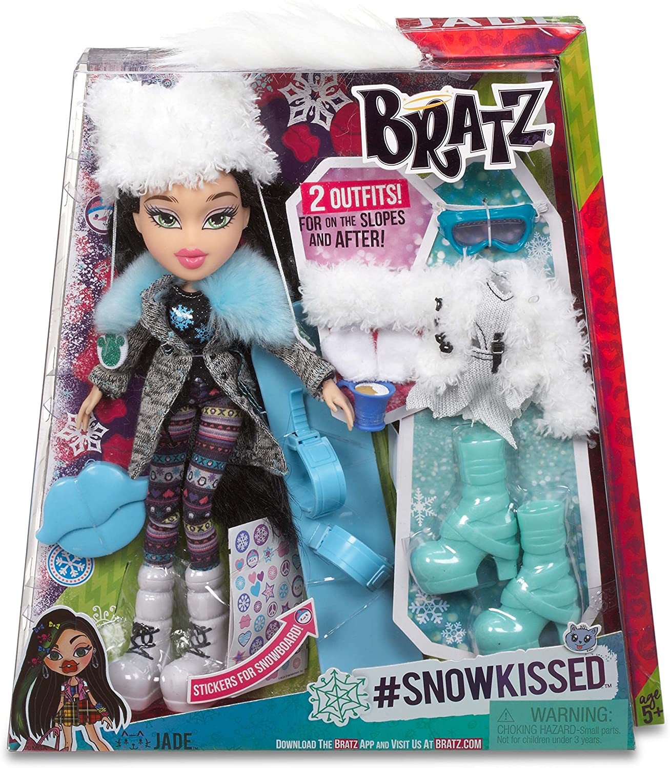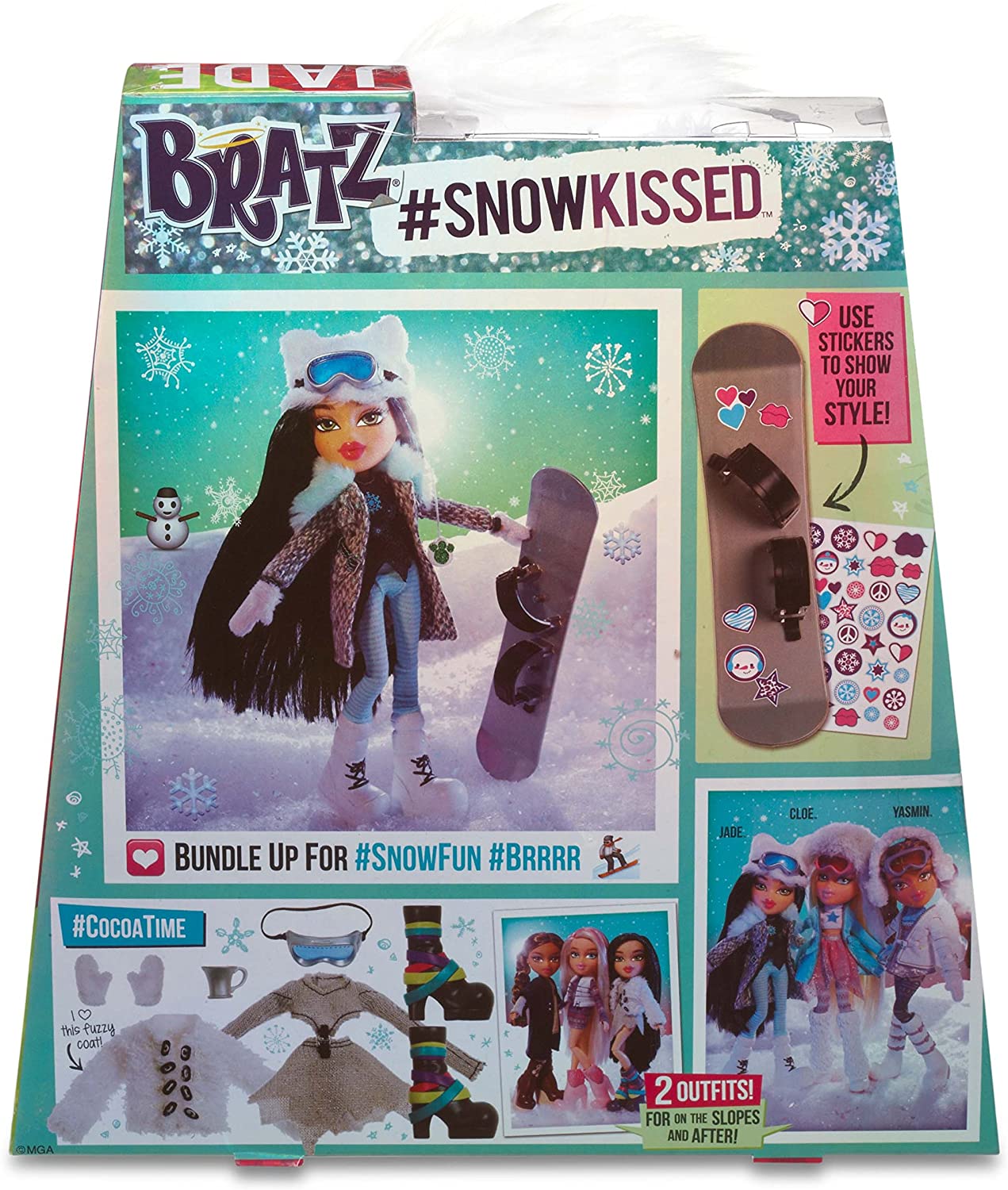 - Bratz #SnowKissed Doll Jade loves to hit the slopes with her snowboard in her fuzzy cat-ear hat and stylish winter outfit