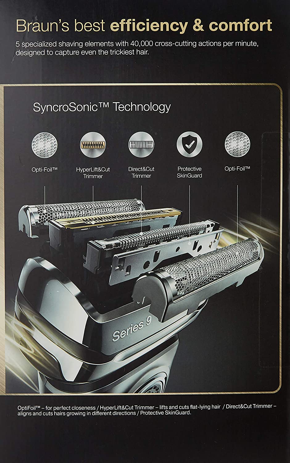 BRAUN Series 9 World’s most efficient shaver. Exceptionally gentle. With SyncroSonic technology and a Titanium coated middle trimmer. Five specialized shaving elements capture more hair in one stroke for fewer strokes and less skin irritation. SyncroSonic Technology Features & Specification SyncroSonic technology with 40,000 cross-cutting actions per minute. Multiplied by Sonic technology. Braun’s patented SyncroSonic technology reads and adapts to your beard. Checking its density 160 times per minute. Providing extra power exactly where needed most. As beautiful as gold yet much harder. Titanium is an extremely durable metal and highly resistant to corrosion. Plus, it makes quite an appearance. That‘s why Braun uses it for the coating of the trimmer. HyperLift & Cut trimmer Lifts and cuts flat lying hairs. Direct & Cut trimmer Aligns and cuts hairs growing in different directions. Protective SkinGuard Smoothens the skin for an exceptional shaving experience. 2x Opti-Foil For perfect closeness that lasts longer. 10-D Flexible Shaving System Independently flexible cutting elements mounted on a 10 directional pivoting head: MicroMotion combined with MacroMotion for maximum facial adaptability, giving you more skin contact for a more thorough shave. Clean & Charge Station The World‘s only 5 action alcohol-based Clean& Charge station automatically cleans, lubricates, dries and charges your shaver.