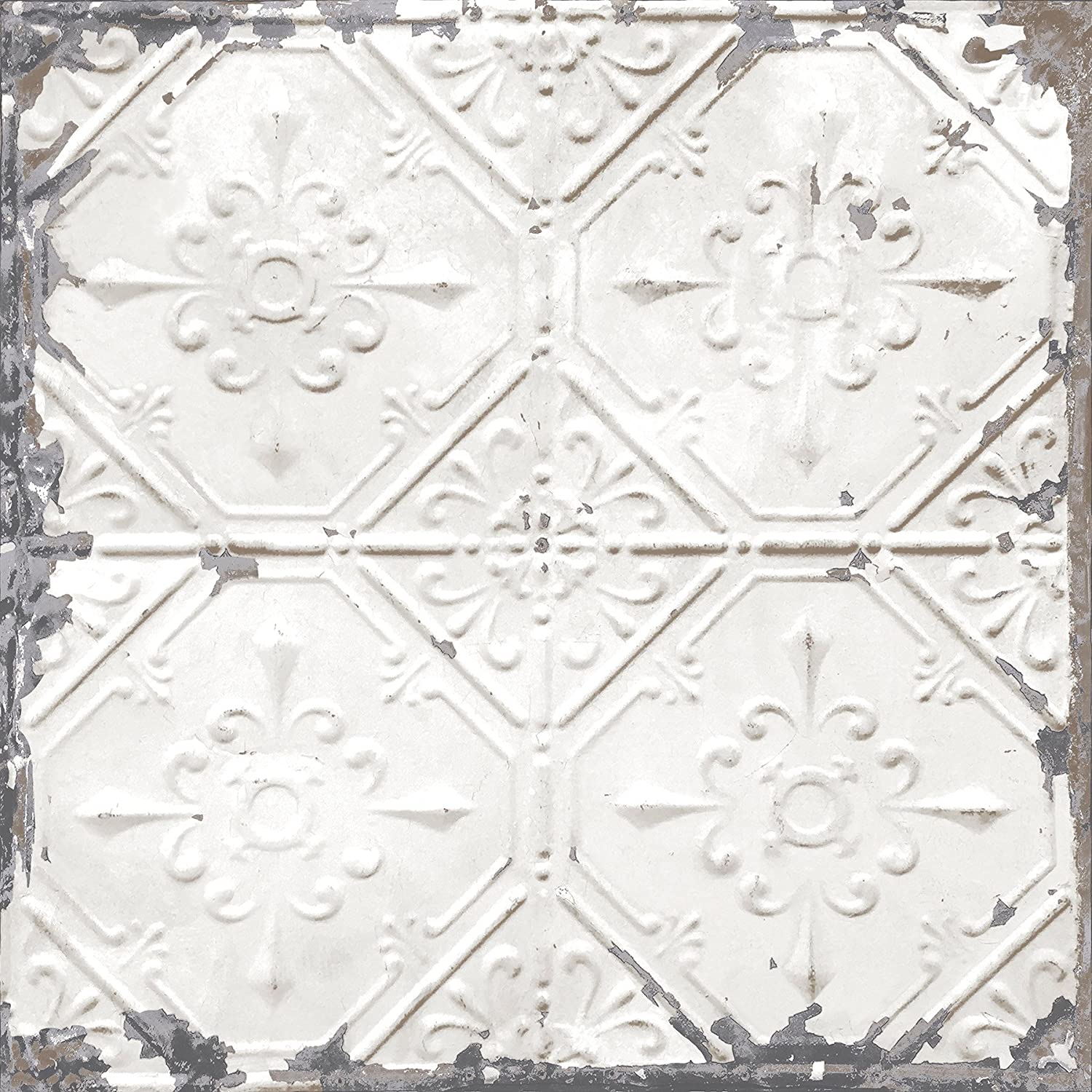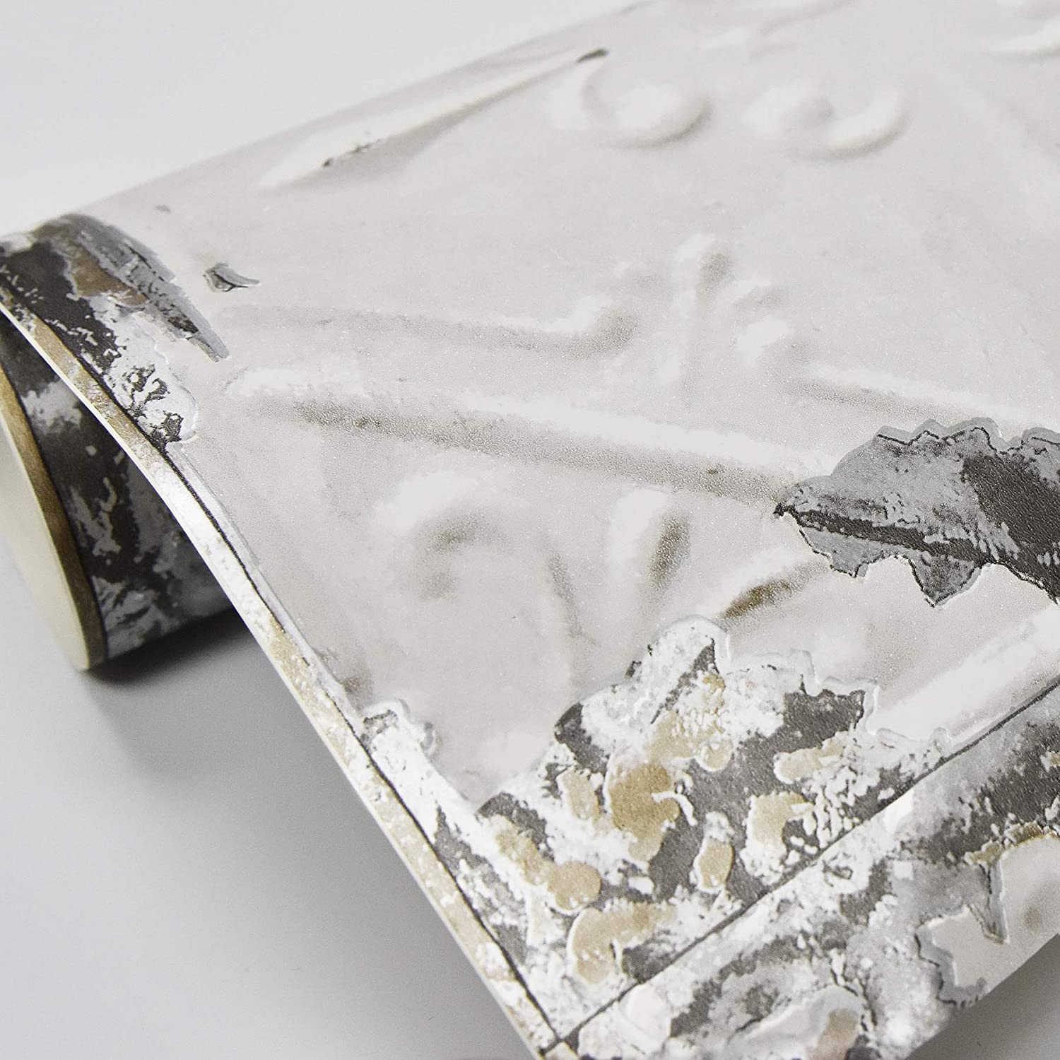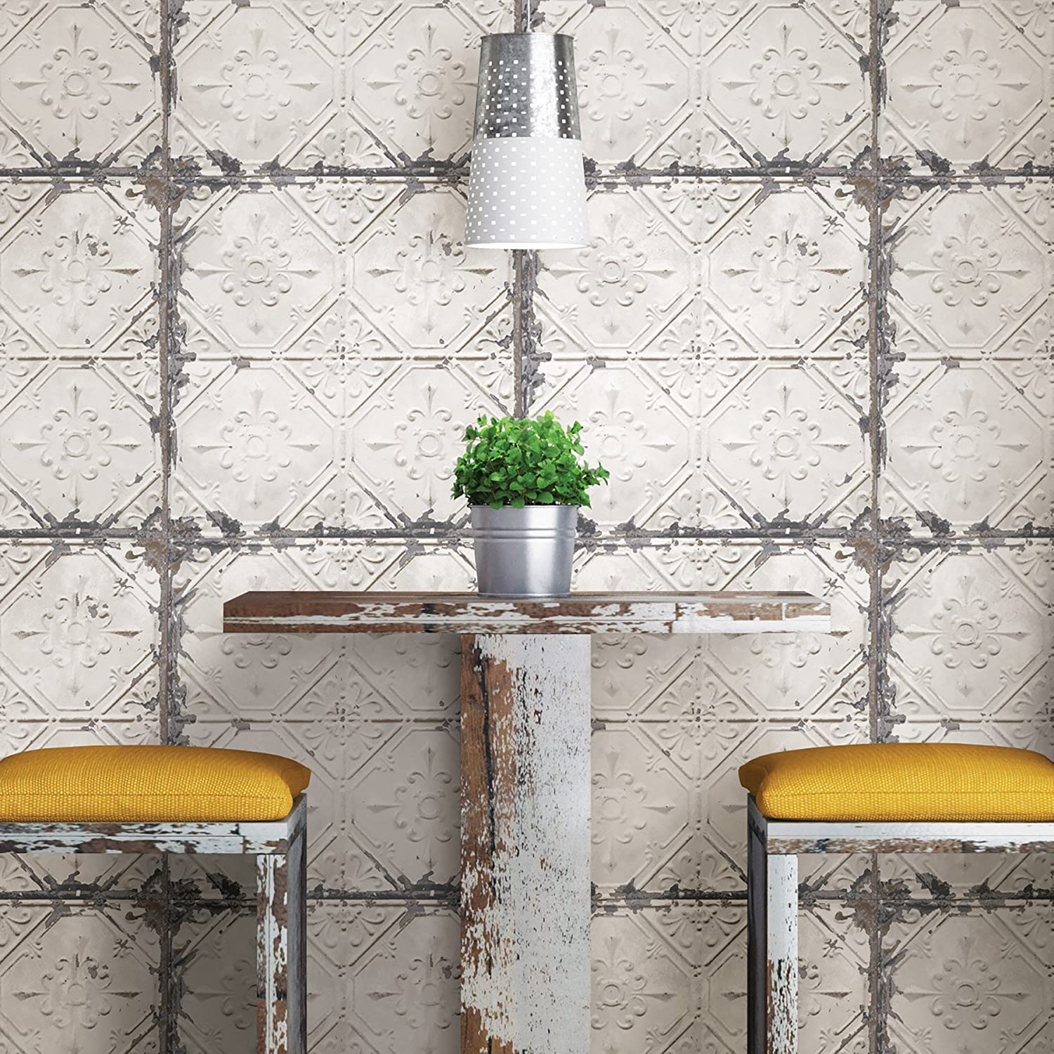 This tin ceiling tile wallpaper will add an antique charm to any room. The peel and stick material is perfect for DIY projects, apartment decor and anybody looking to wallpaper with ease because it won't harm your walls. Metallic accents create a realistic metal look. Comes on a 20. 5 in x 18 ft roll.