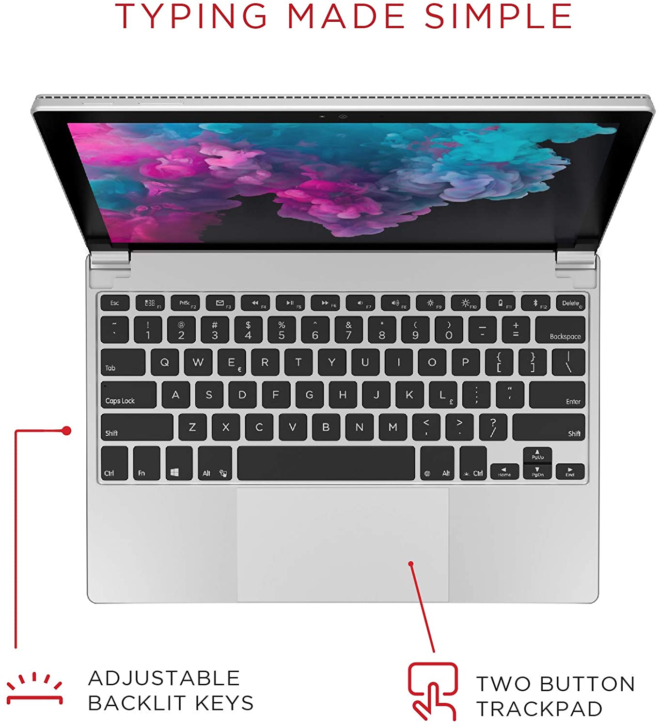 • 2 BUTTON TOUCHPAD | New and Improved integrated Glass Trackpad for optimum sensitivity. Syncs with the Surface Pro for adjustability within Windows. Long lasting battery with up to 3 months of use with integrated 1200mAh battery.