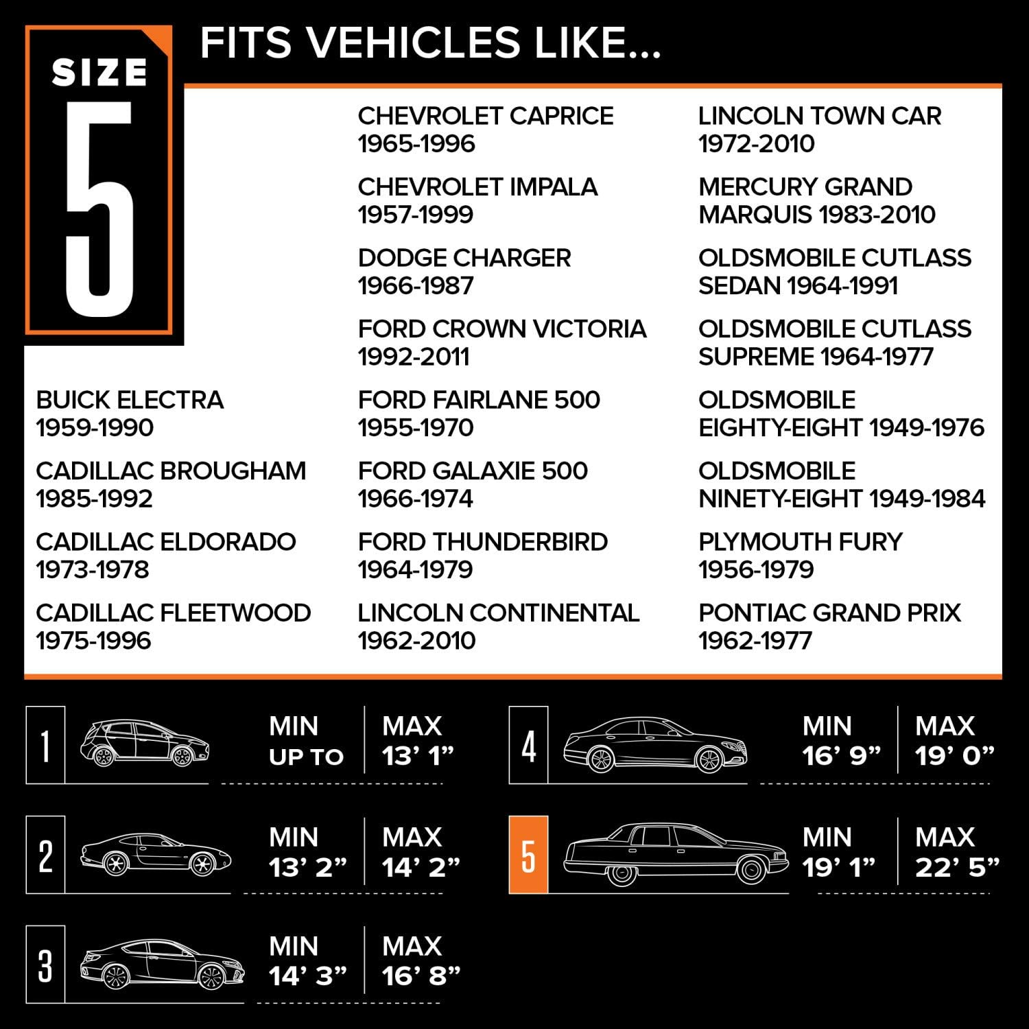 • This car cover fits vehicles like: Chevrolet Impala, Ford Thunderbird, Cadillac Eldorado, Dodge Charger, Oldsmobile Cutlass Supreme. These sizes are recommendations. Please be sure to measure your vehicle before placing your order.