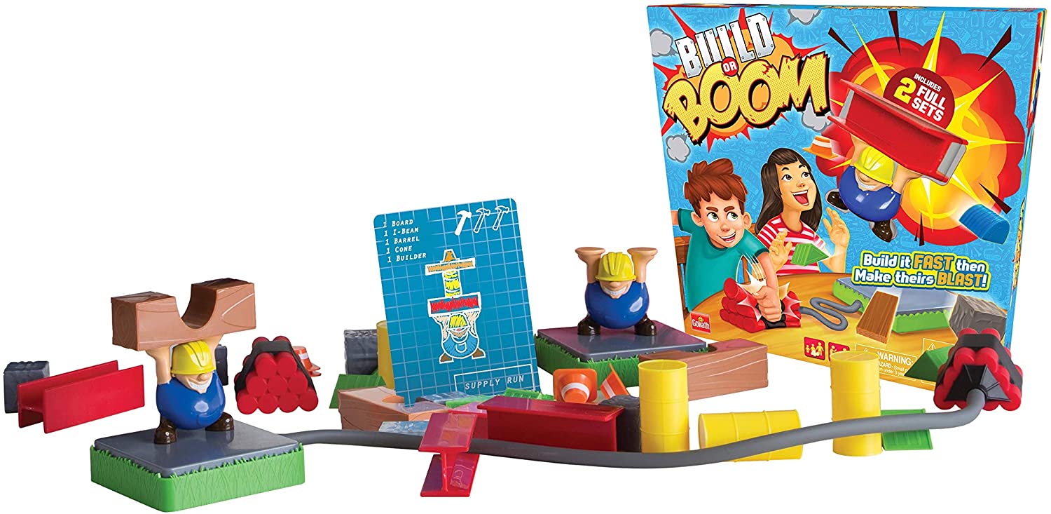 The big Boss is looking for the best builders in town! Step in line and see who can be the first to bring the blueprint cards to life. Build your structure carefully but quickly on your platform, and then smash your Boomer to send your opponent's structure tumbling. There's only room for one Builder in this town...Do you have what it takes? Or will you get boomed on your way to the top? For 2 players, ages 4 and up.
