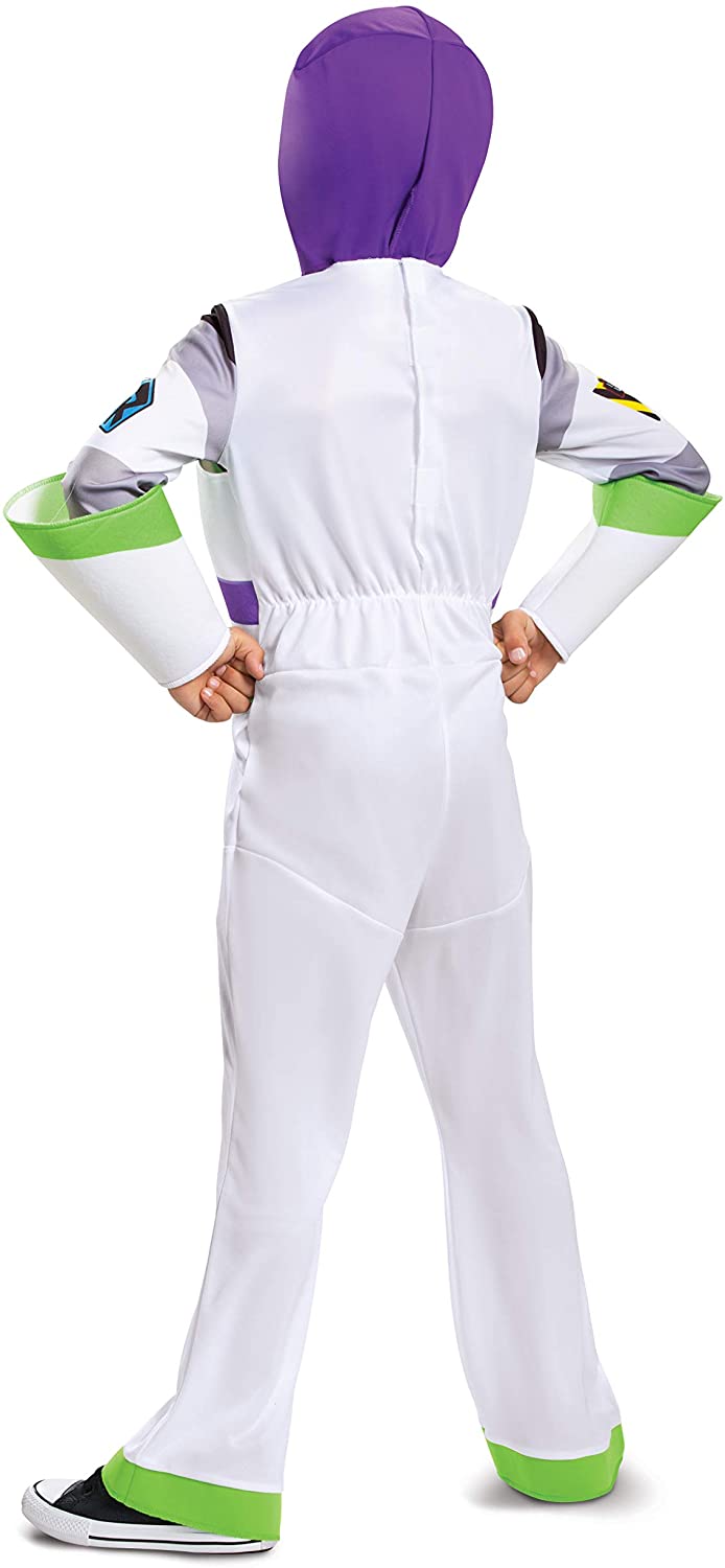 Your little one can go to "Infinity and beyond" This Halloween in this Buzz Lightyear classic costume! This costume features a jumpsuit with sublimated artwork, front bodice dimensional overlay, dimensional pant cuffs, green pant trim and separate hood.