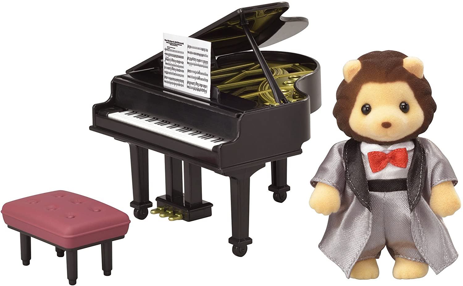 The Grand Piano Concert Set is a figure and accessory set containing Lionel the Lion pianist and a grand piano. The Lion pianist has special hands to touch the keyboard. He wears a stylish tuxedo, perfect for his recital. A stool and score are also included. Collect the Violin Concert Set and Cello Concert Set too to enjoy a piano trio recital. Combine with shops, furniture, and figures of the Town series for more fun (all sold separately). Lionel the Lion pianist, grand piano, stool, score (total 4 pieces).
