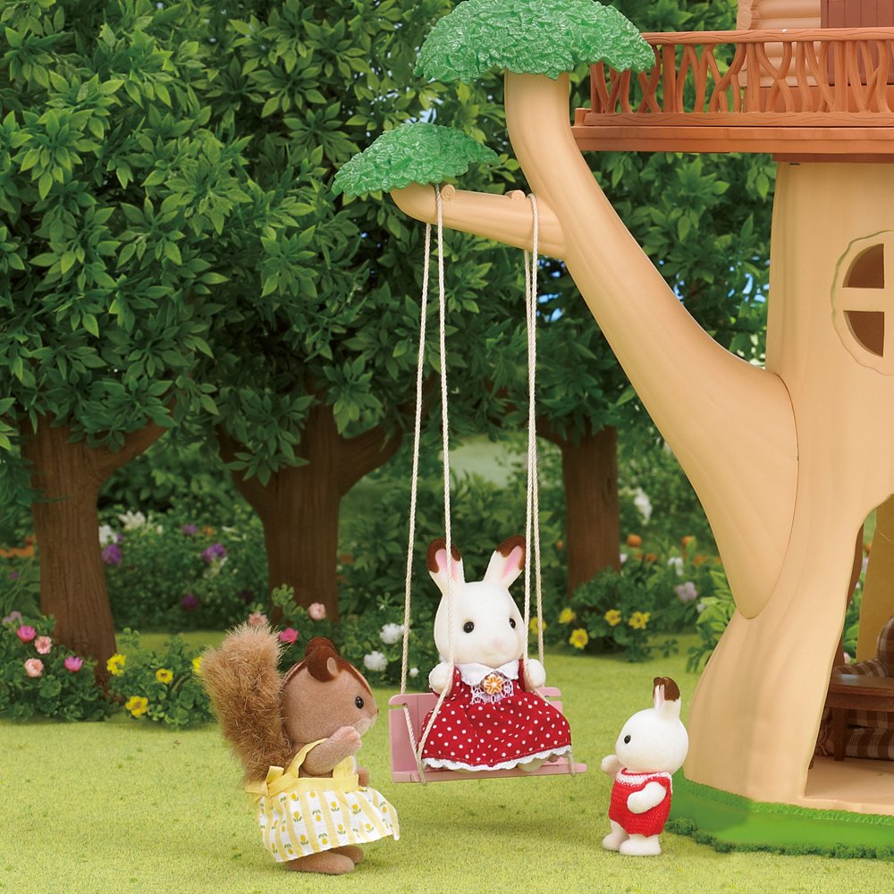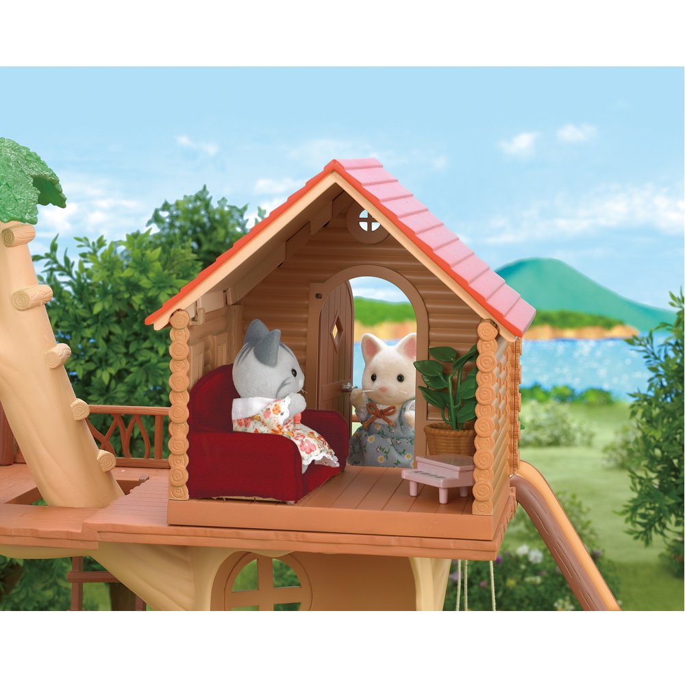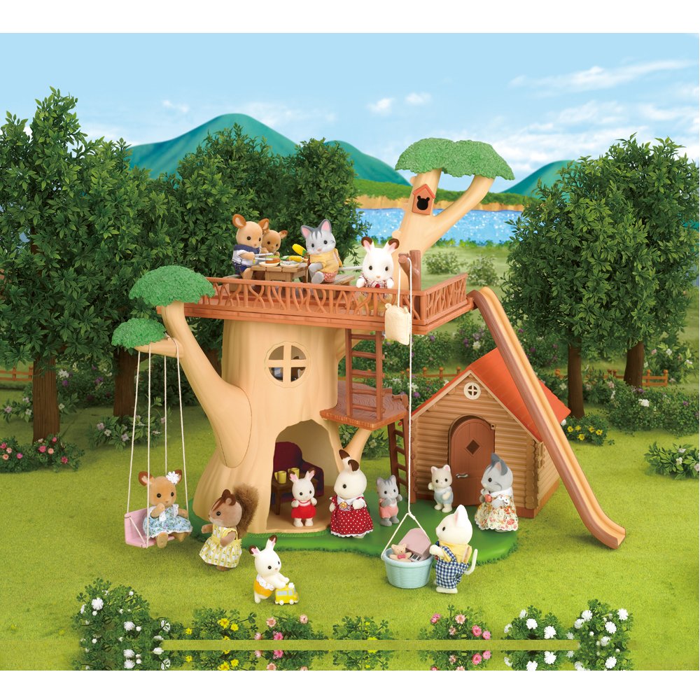- This gift set includes the Adventure Tree House with slide, moveable cabin, spacious sundeck, tree swing and basket pulley that doubles as a baby elevator! Over 65 pieces of food, playroom furniture, picnic table/grill, fishing gear, baby slide, toys, blocks, books and 3 posable Critters!