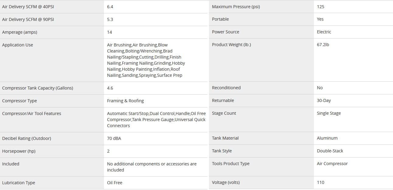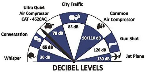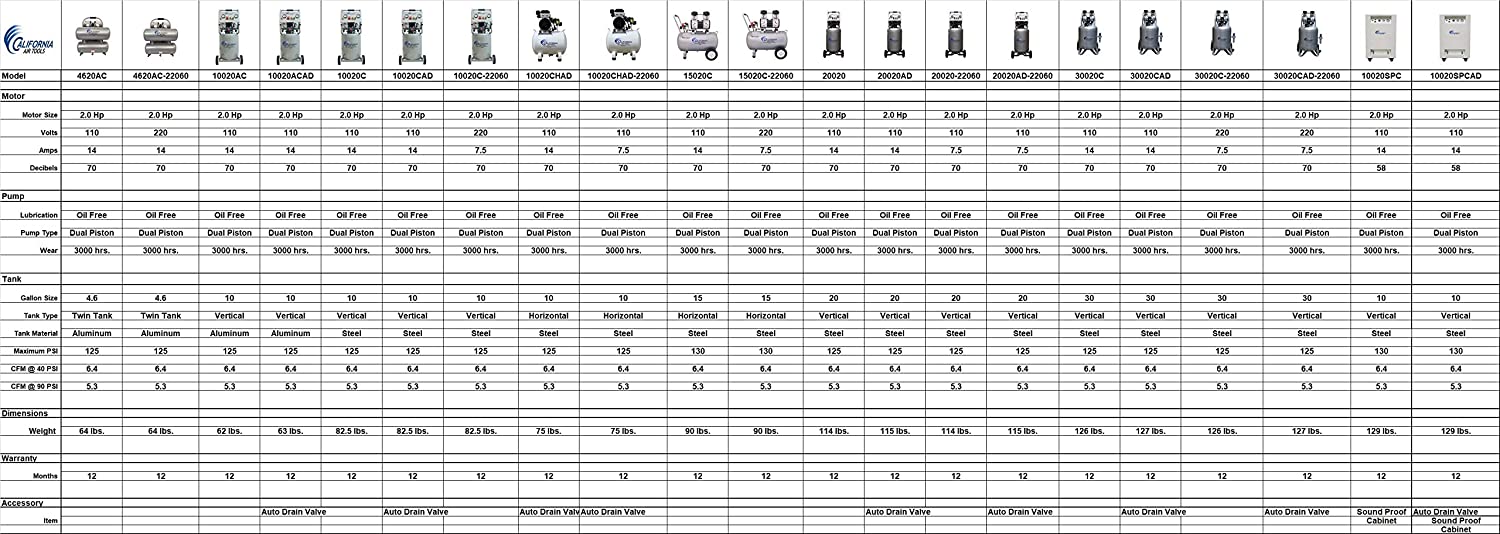 The CALIFORNIA AIR TOOLS 4620AC Ultra Quiet & Oil-Free Air Compressor is designed to be one of the quietest 2.0 Hp air compressors in the industry having only 70 decibels of sound. The Powerful "New" 2.0 HP (SP-9421) motor operates at only 1680 RPM creating less noise and less wear. The "New" SP Series of Ultra Quiet Air Compressor Motors have been designed to increase duty cycle and allow for longer continuous run times. The Oil-Free Dual Piston Pump System is engineered for high performance and durability. The CAT-4620AC Air Compressor has a Oil-Free Dual Piston pump designed to have a life cycle before wear of 3000 Plus hours compared to other comparable air compressors with life cycles of 500 hours or less. The Oil-Free pump allows for use in a variety of temperatures (cold starts) and uneven terrains (no oil in the pump). The Easy Start Valve feature allows for a easier start up using less starting amps. The Easy Start Valve releases a small amount of air from the pump at start up to produce a no-load condition allowing the motor to spin freely. This no-load start up requires less amps for an easier start up in cold temperatures. The large 4.6 Gallon Aluminum Air Tank is only 67.2 pounds making it very easy to move around the jobsite. Designed for the person looking for Power, Air Flow, Less Service and Maintenance with at Least 30% Less Noise.Low Amp Draw - 14 Amps
