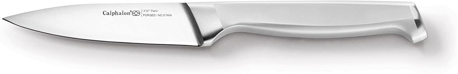 Knives stay sharp for a lifetime with Calphalon classic stainless steel Self Sharpening cutlery with SharpIN technology. Sharpeners are built right into the block, automatically sharpening straight edge knives every time you remove them from the block to ensure peak sharpness at the start of every cutting task. Knives are made from high carbon, no stain forged steel, and feature forged construction and a comfortably balanced handle. In addition, knife handles are labeled so you can always pull the correct knife out of the block. Sets include a great selection of essential knives for dicing, chopping and more.