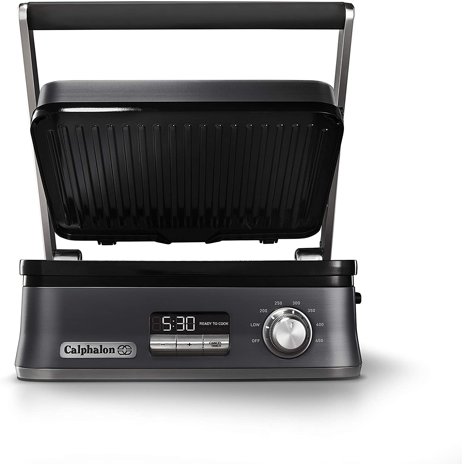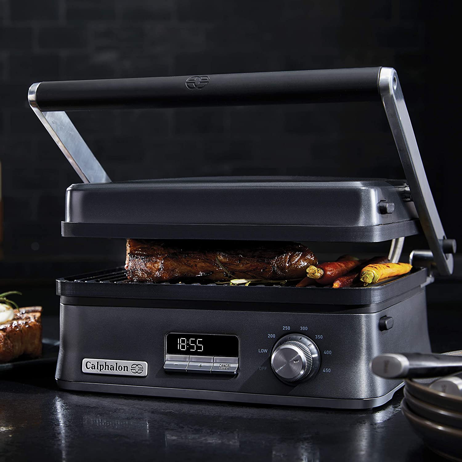 Grill meats and vegetables to perfection in the comfort of your home with the Calphalon Even Sear Indoor Electric Multi-Grill. The embedded heating elements and ceramic cooking surface deliver precise temperatures and create 20% more even heat* for better searing performance. The multi-grill contains two sets of large removable plates: ribbed grill plates and flat griddle plates. This 2-in-1 appliance opens a full 180 degrees, making it ideal for open grilling, or use the griddle plates for breakfast items and delicate fish recipes. The high-contrast LCD screen displays countdown timer and heating progress for intuitive control. Metal construction and a ceramic cooking surface that is 11x more durable* than standard nonstick surfaces provide long-lasting performance. When closing the lid for contact grilling, an adjustable floating hinge design accommodates different food thicknesses so even the biggest steak and chop cuts can easily be grilled.
