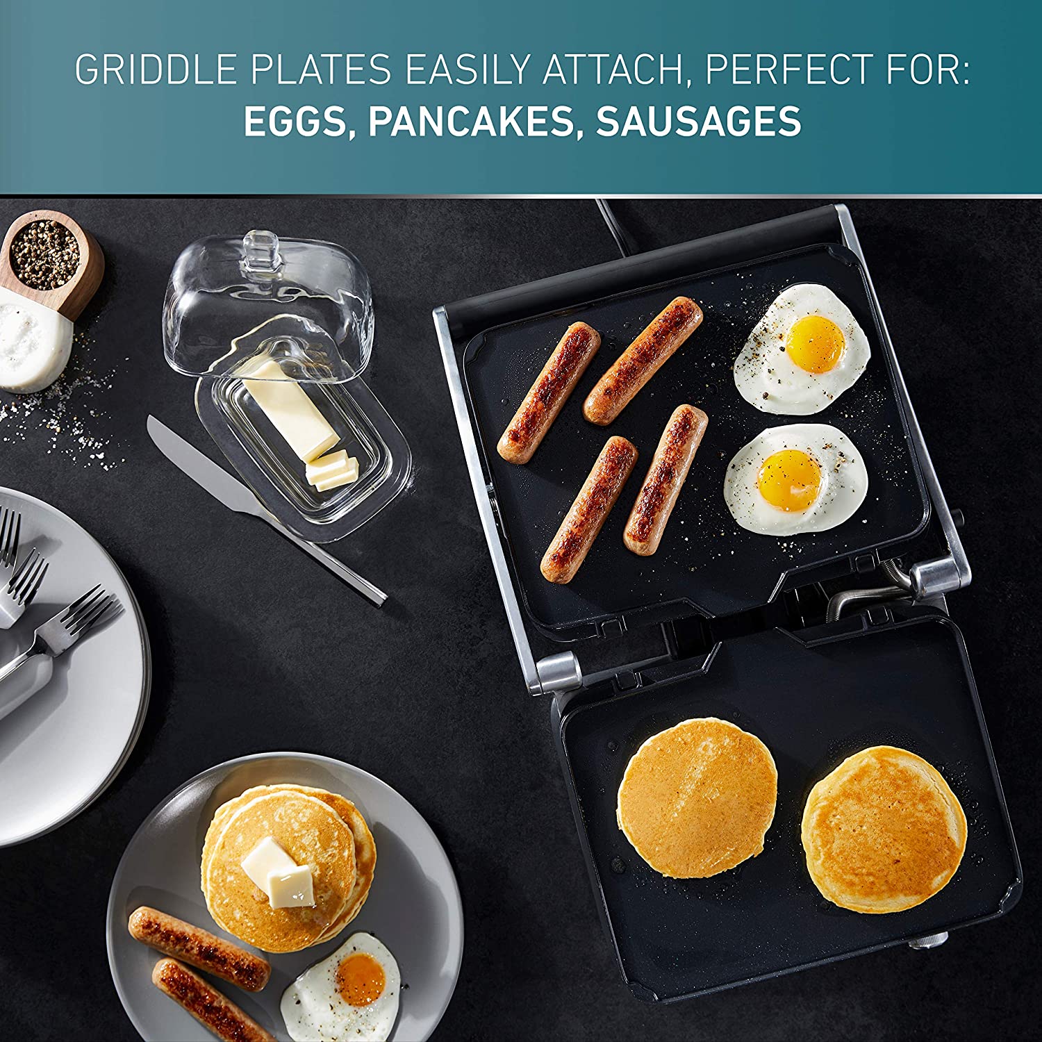 - Includes two sets of large 11” x 8” cooking plates: ribbed grill plates and flat griddle plates