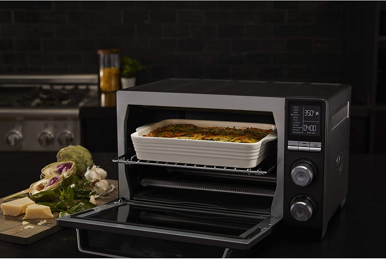 The Calphalon Quartz Heat Countertop Toaster Oven is designed with an innovative quartz heating element to deliver 40% more even heat*, for even cooking and crispy consistency. With faster preheat* and precise cooking, it saves you time and reduces the need to use your range oven. The built-in preset cooking functions feature all major cooking methods, including a dehydrator mode that easily makes apple chips, beef jerky, and more. It’s large enough to fit a 12” pizza, and precise enough to roast a chicken with delectable results. And, don’t forget about dessert—you can create delicious brownies, cupcakes, and pies with perfect consistency.