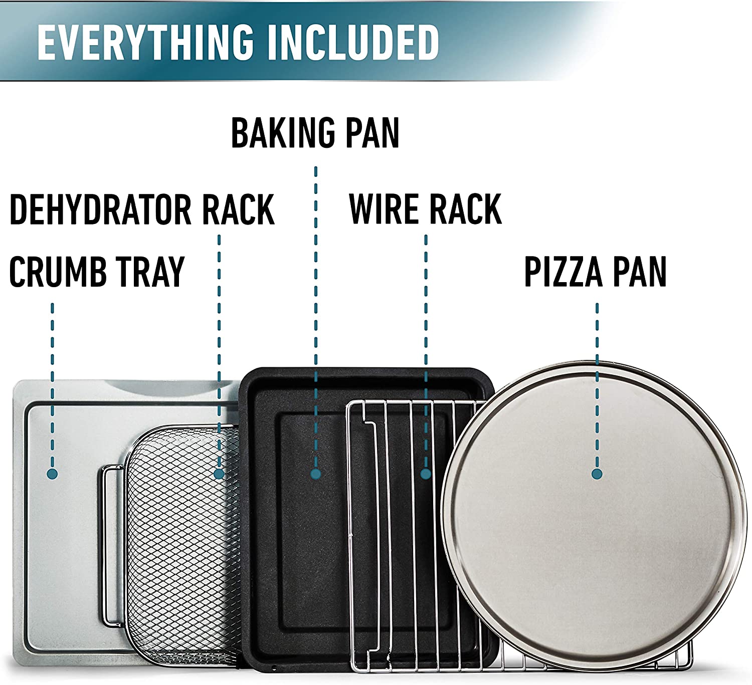 - Included accessories: baking pan, pizza pan, dehydrator rack, and wire rack