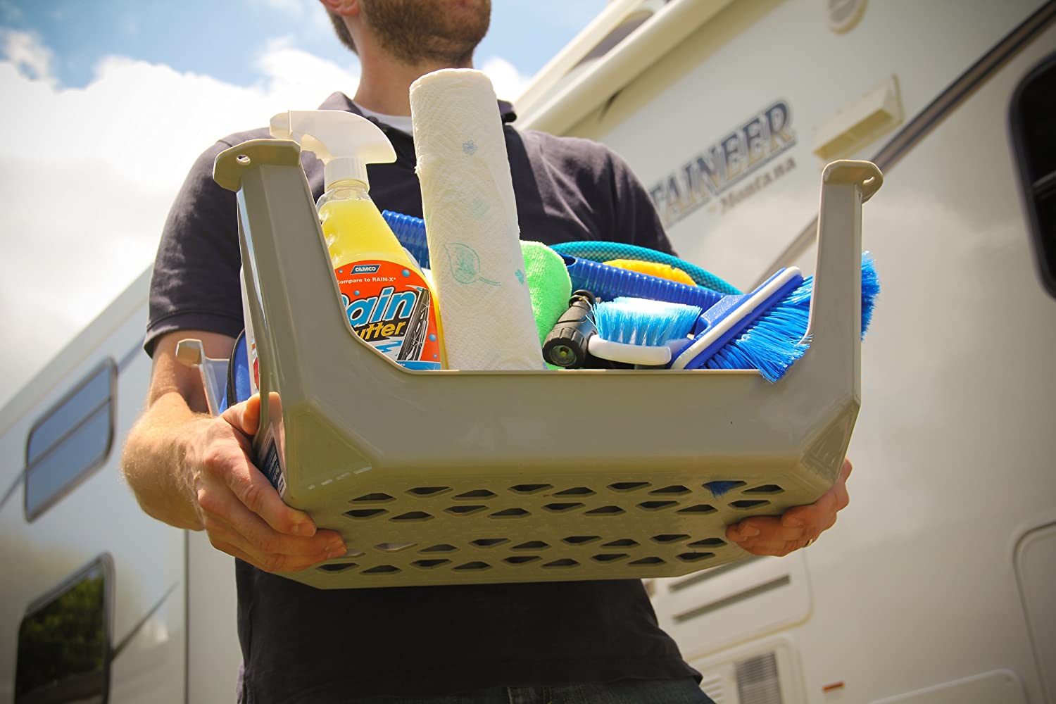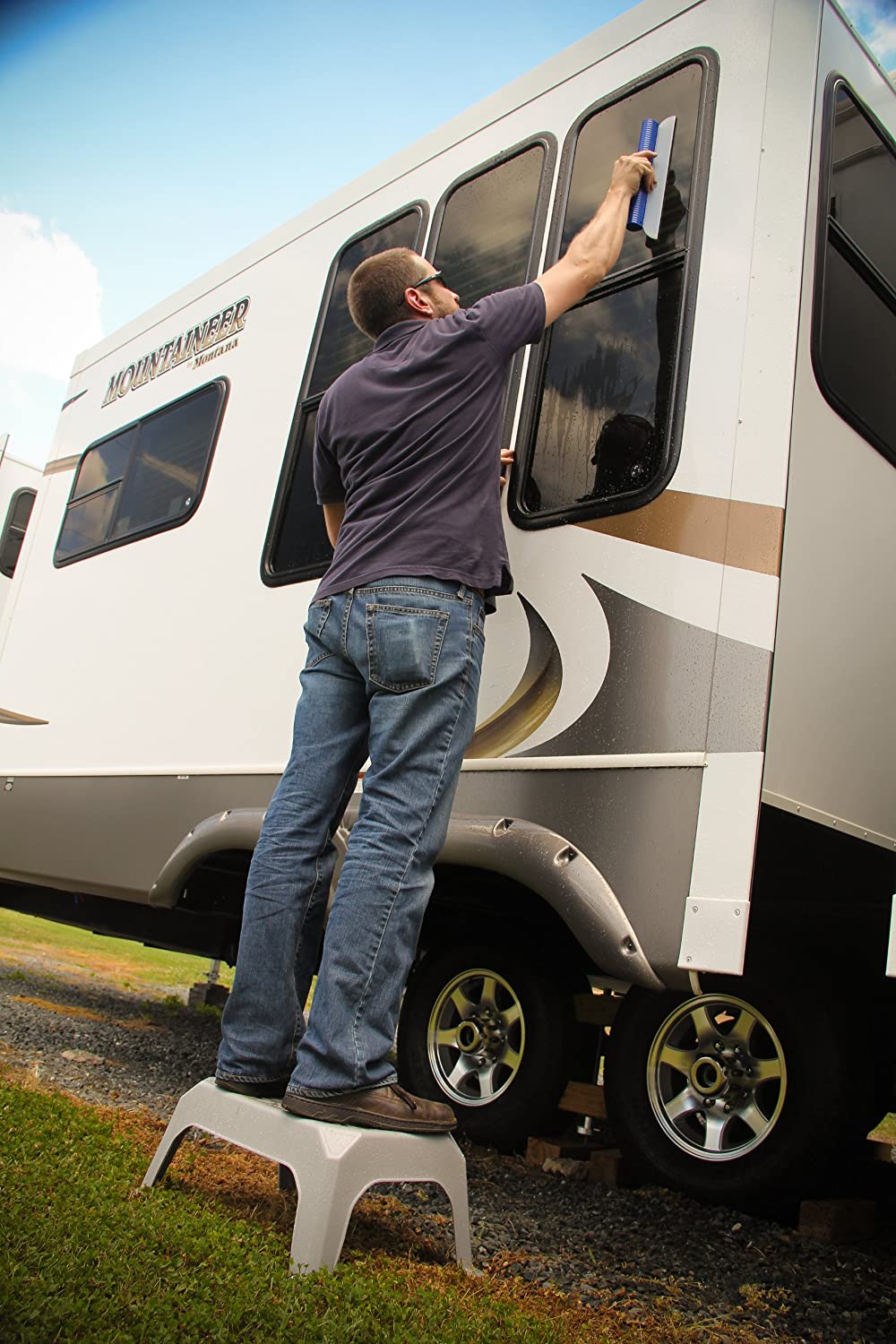 Camco's large step stools are made of a UV stabilized impact resistant resin that is lightweight, yet tough enough to support weights up to 400 lbs. The platform has a textured surface to help prevent slipping and measures 11" x 18". The step stool is 9-1/4" tall, weighs only 2.5 lbs and can be nested for easy storage.