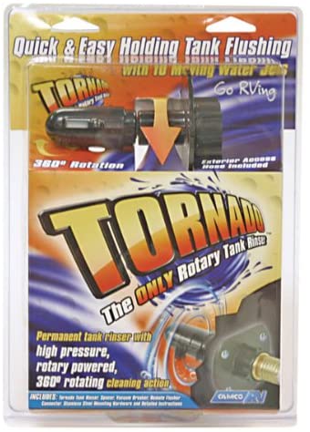 Camco RV Tornado Rotary Tank Rinser with Hose helps to reach every area of your holding tank. This permanent tank rinser with 360° rotating head and multiple high-pressure nozzles is the easiest, most sanitary way to clean your holding tank. No need for hoses through the windows or devices stuck down toilets. Includes a backflow preventer and 6' exterior access hose for quick hose connection with no mess. Patented.