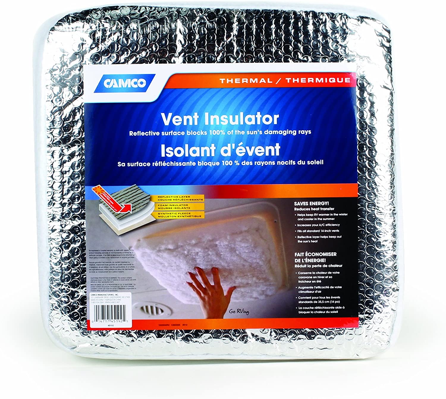 Camco RV Vent Insulator with Reflective Surface fits snugly in RV vent opening with a full 2.75" of foam to help stop heat transfer, keeping your RV cooler in summer and warmer in winter. Reflective surface blocks 100 percent of the sun's damaging rays. Fits standard 14" RV vents.