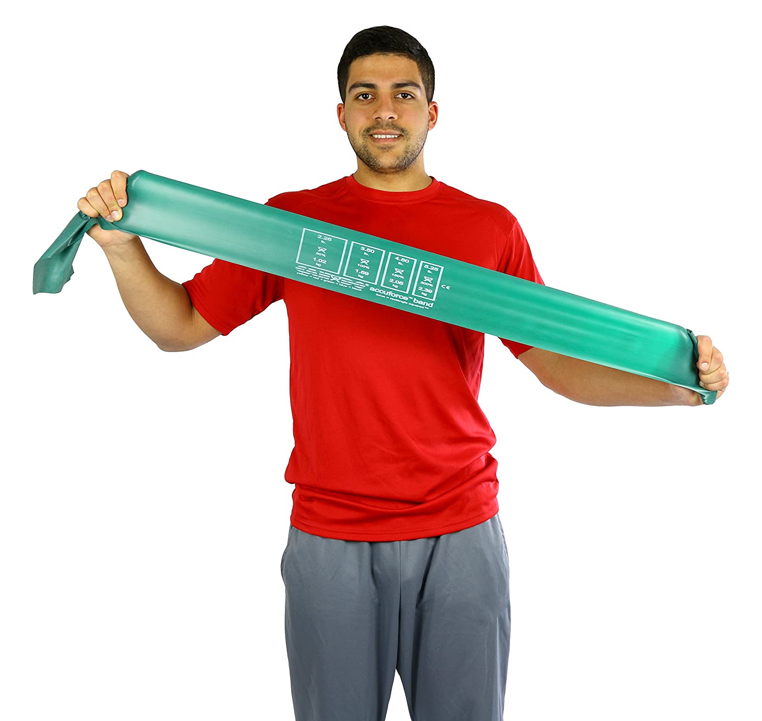 AccuForcelow-powder exercise band. Exerciser is packaged in a polybag. Simply remove exercise band from polybag and it is ready to use. Achieve specific repeatable and measurable levels of performance with each rep. The specially designed band allows the user to know how much force is being used when exercising. Simply stretch the band and watch as the box changes from a rectangle to a square showing your exertion. CanDo high quality latex resistive exercise band has been used in clinics for rehabilitation, conditioning and training since 1987. It has become a well known staple of many physical therapy programs. CanDo exercise band is an economic solution for upper and lower body exercise. Lightweight, compact and portable. Durable. Effective when used alone, or with handles and anchors. Color-coded according to the exercise band’s resistance. CanDo is licensed to use the Thera-Band color sequence so resistance level is easily identified. Available in 8 levels of resistance for progressive exercise. Levels range in order of resistance from least to greatest resistance: tan, yellow, red, green, blue, black, silver, gold. Uniform width - each band is 5" wide. CanDo low powder exercise band is made of natural rubber latex, which may cause allergic reactions. For those with latex sensitivities, there are latex-free alternative offerings of CanDo exercise band.