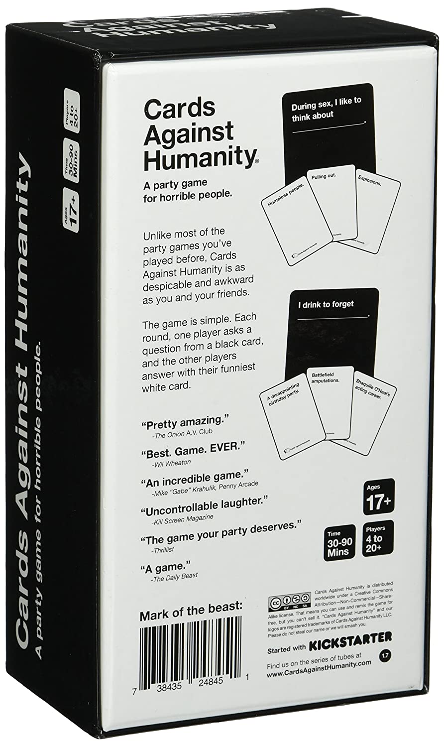 Cards Against Humanity is a party game for horrible people.Unlike most of the party games you've played before, Cards Against Humanity is as despicable and awkward as you and your friends. The game is simple. Each round, one player asks a question from a Black Card, and everyone else answers with their funniest White Card.Reviews of Cards Against Humanity:"Pretty amazing." -The Onion AV Club"An incredible game." -Mike "Gabe" Krahulik, Penny Arcade"Uncontrollable laughter." -Kill Screen Magazine"The game your party deserves." -Thrillist"A game." -The Daily Beast