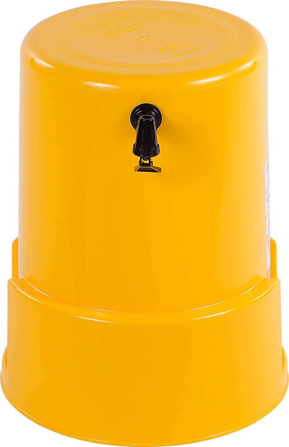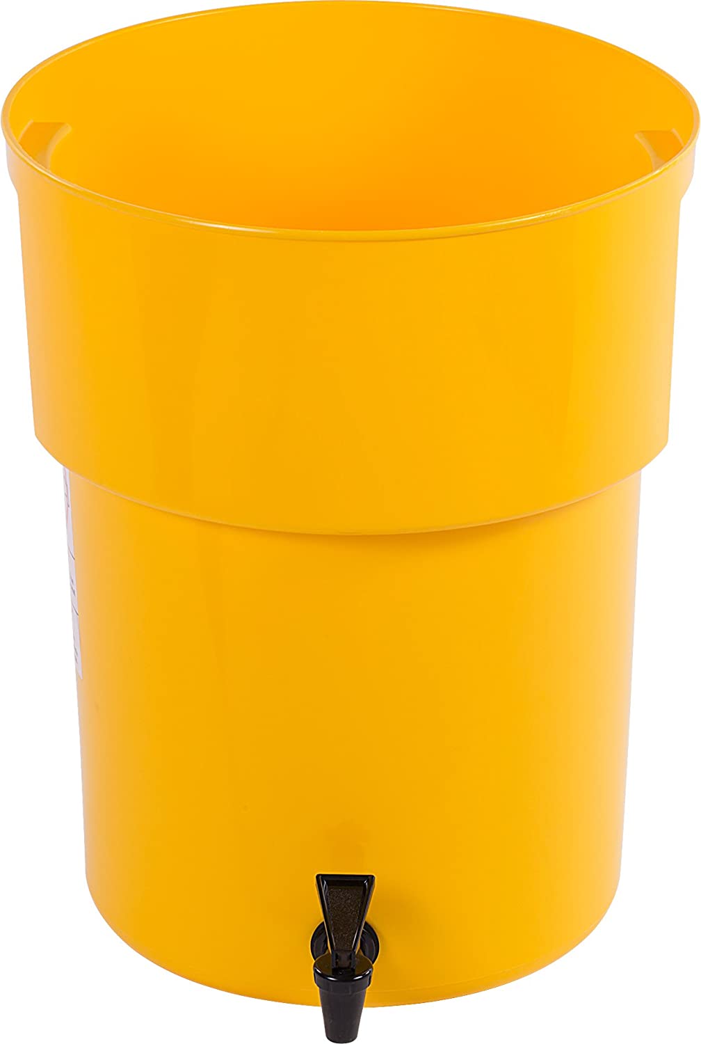 Carlisle round beverage dispenser. Base provides access to faucet from convenient serving height. Includes labels for iced tea, lemonade, fruit punch, sweetened and unsweetened tea. Spring action faucet provides fast flow and dripless service. Channel inside reservoir draws all of beverage. Embossed measuring lines in 1-quart increments. Dispensers and bases sold separately or as set. BPA free. Dishwasher safe. Made in USA. 5 gallon capacity. Measures 12.37-inches diameter by 15.43-inches height. Yellow color.