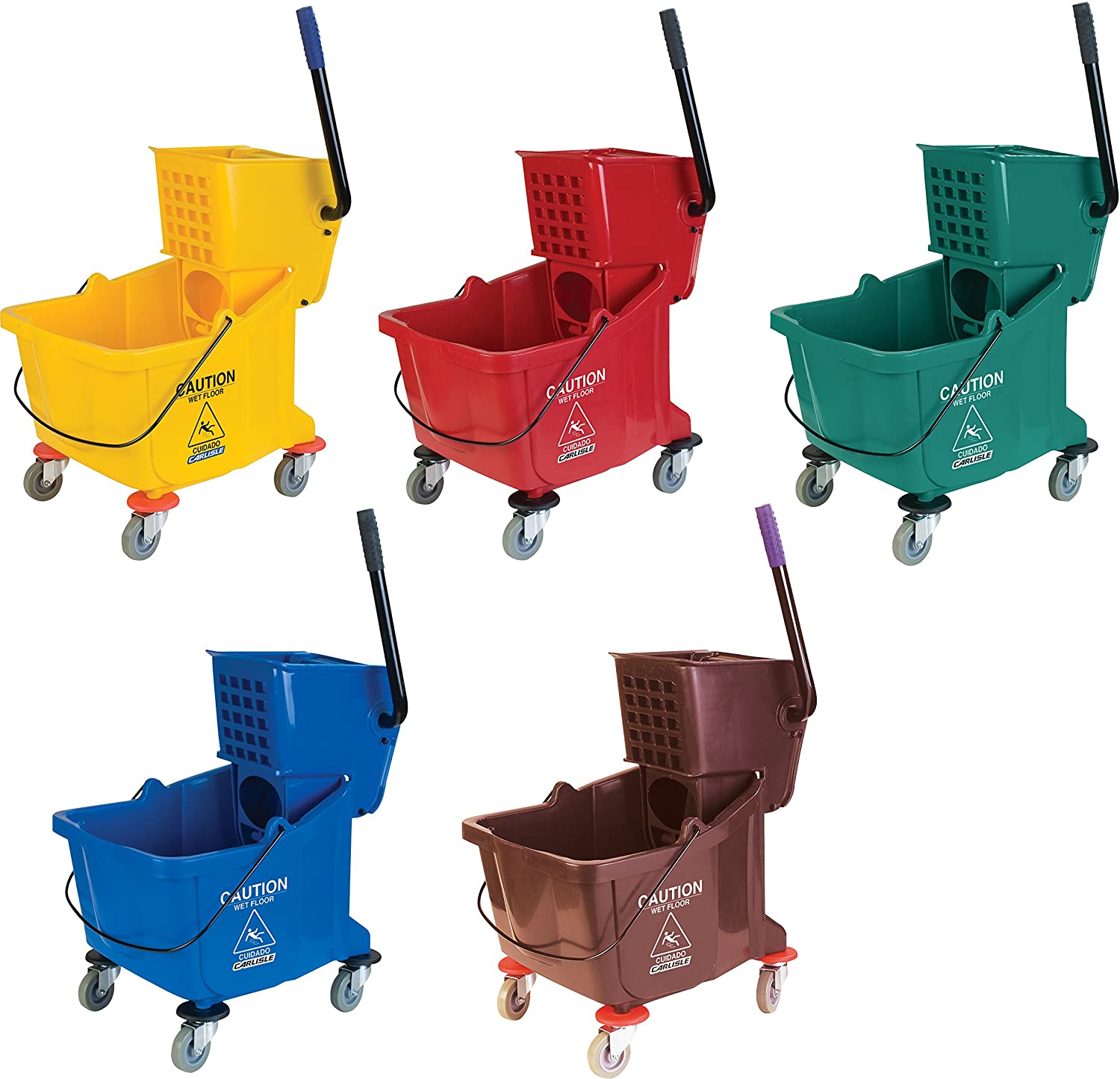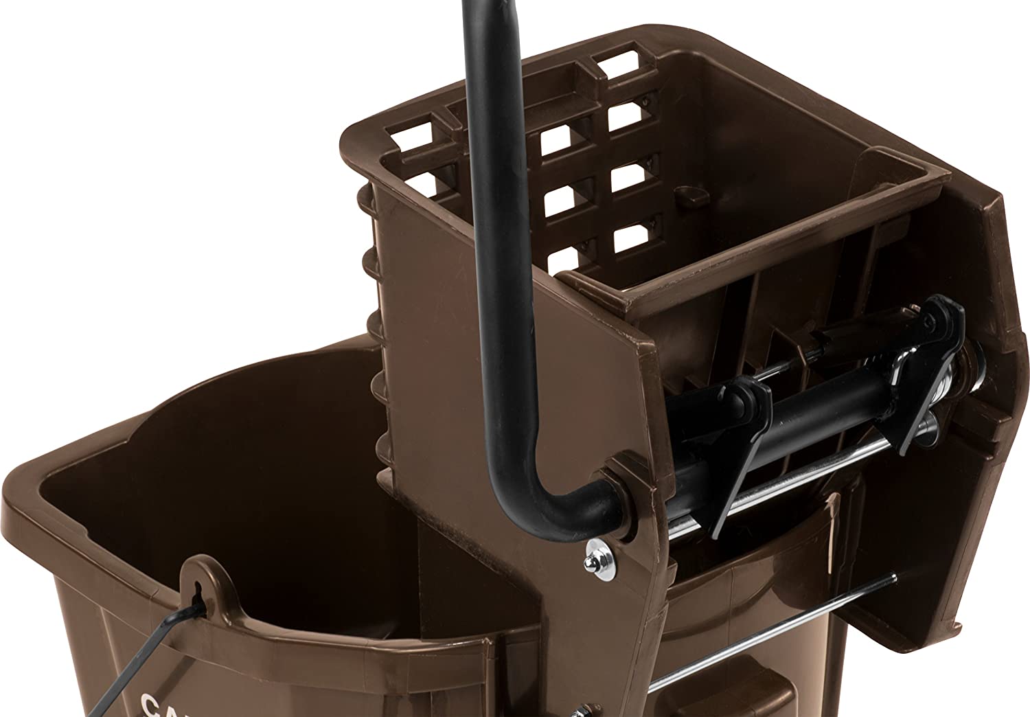 This Carlisle 3690869 brown 26-qt. capacity mop bucket has a compact design and a side-press wringer to extract excess liquid from a mop and funnel the liquid back into the basin. The bucket and wringer are made of polyethylene for durability and corrosion resistance, and have four non-marking casters for mobility. The bucket is 13-1/4" high, the wringer is 23" high, and the top of the handle is 34-1/4" high. The overall dimensions of the item are 18-1/2 x 16-1/2 inches (length x width).