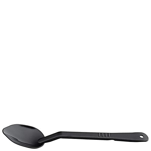 This Carlisle 442603 black serving spoon is 13" in length with a 1.5-oz. capacity and can be used on high temperature surfaces such as steam tables. It is made of polysulfone (PSO) for rigidity and resistance to high temperatures, and it has a temperature range from -40 to +375 degrees F. It is perforated for draining liquids and fats. It has a notched handle for resting on the edge of a food pan and a hole on the end for hanging. This serving spoon meets NSF International standards for use in food handling and processing and is dishwasher-safe.
