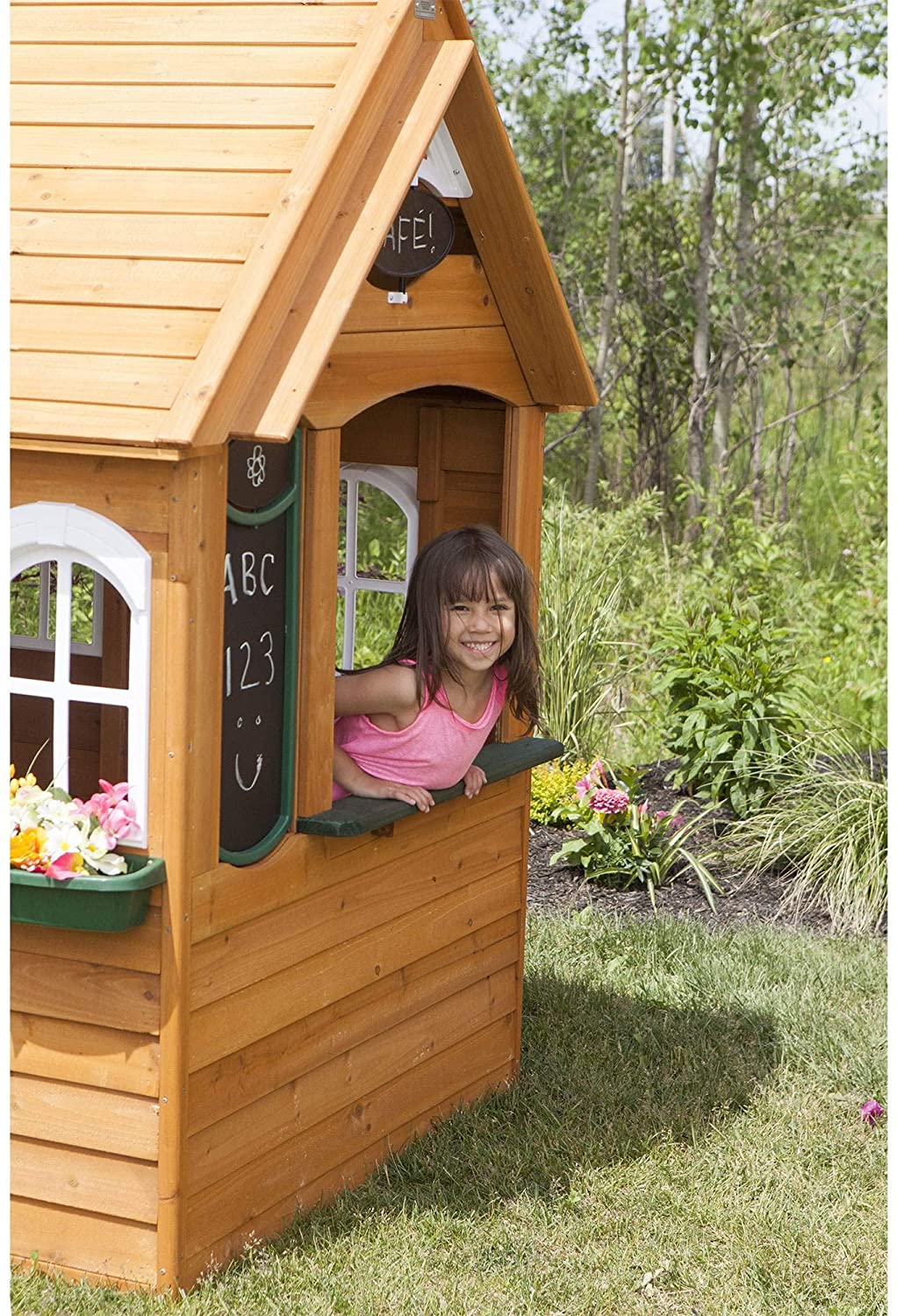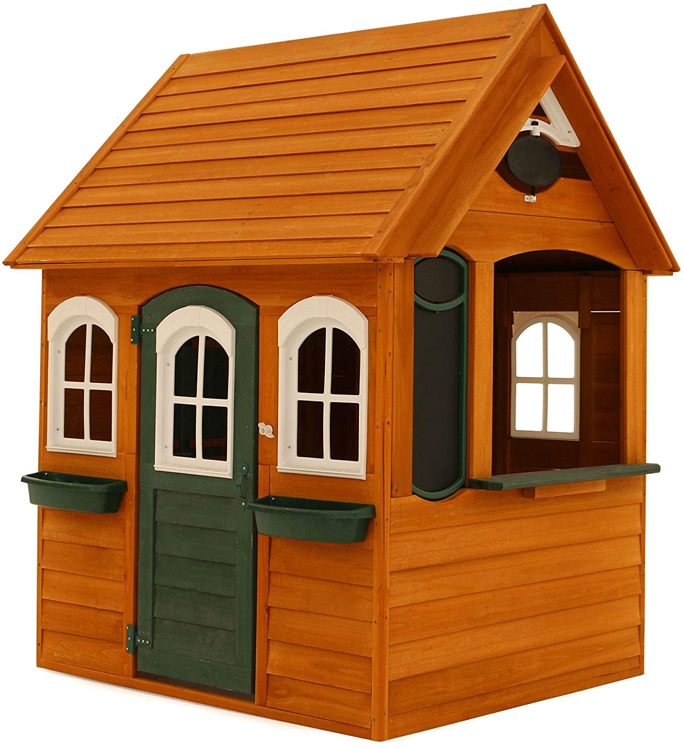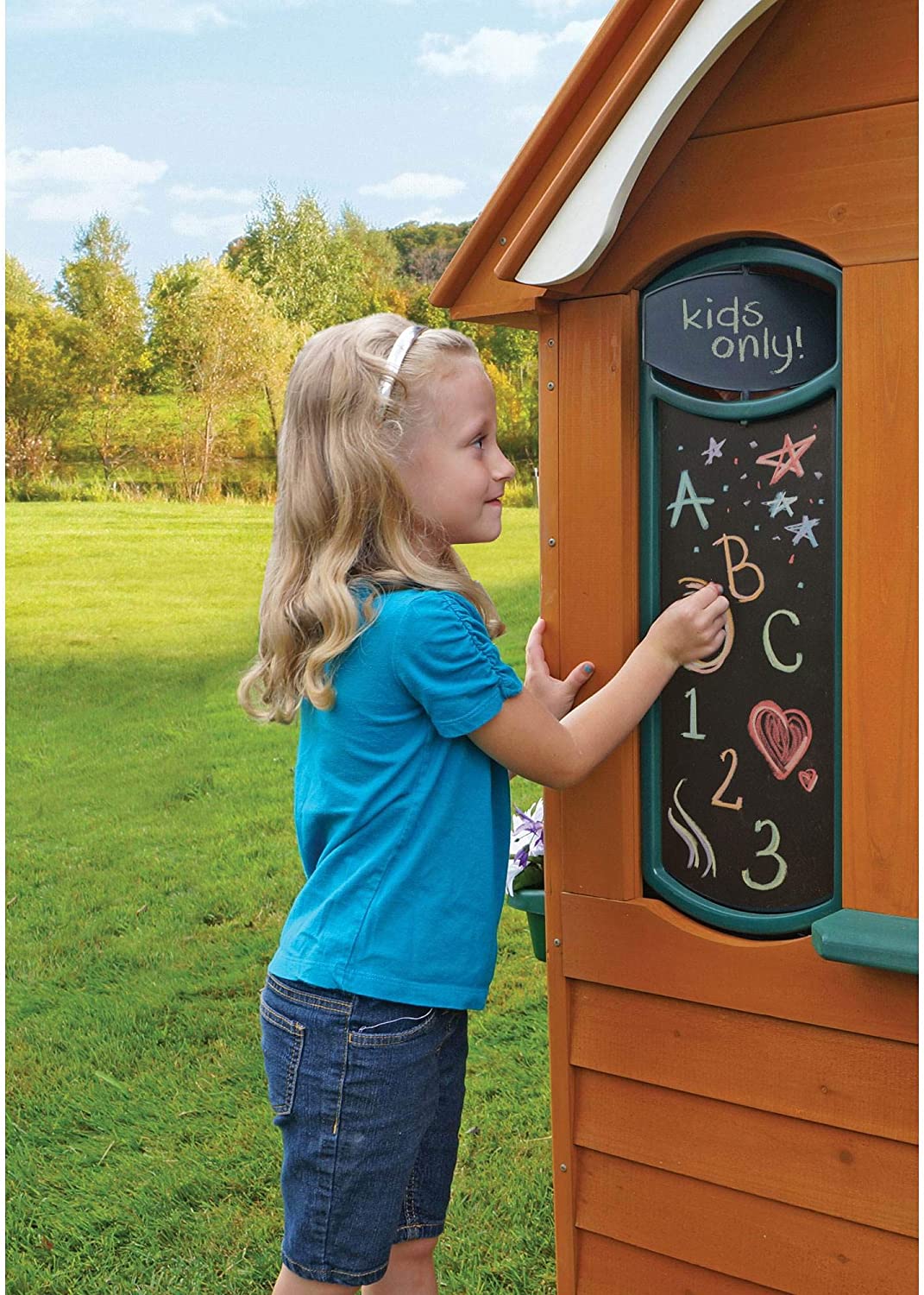 The Bancroft playhouse by Cedar Summit is the perfect addition to any backyard! this beautifully designed playhouse has many details that will keep your children busy and entertained for hours on end. From the working door with doorbell, to the large premium windows with flower boxes the Bancroft has everything! the Café table provides kids with the ideal spot to chat with friends or put on a puppet show. The chalkboard and spin chalk sign provide the perfect starting point to turn the playhouse from a Vet clinic, to a restaurant, to a secret clubhouse. The Bancroft playhouse will be the focus of all your children’s outdoor adventures. Sit back and watch them play and have fun in the safety of their own Cedar Summit playhouse. Craftsmanship and devotion to detail are the hallmarks of the Company. Using 100% premium cedar lumber, the skills and dedication of Associates who produce these elite play sets are bolstered by a commitment to providing innovative designs and features. Important: this product is only for use in residential areas and is intended for up to 3 children ages 3 to 10 with a maximum weight of 110 lb. Per child design features 100% premium cedar lumber pre-cut, pre-drilled and pre-stained cedar lumber with factory applied, child safe stain packaging your Bancroft play set comes in 1 package box 1: 51 ½”L x 43 ½”W x 8”h = 112 lbs features the Bancroft playhouse includes the following play activities Café table chalkboard spin chalk sign working door with doorbell 2 flower boxes (flowers not included) side window with working shutters dimensions overall dimensions (L x W x H): 4’ 8 ¼” x 4’ 4 5/8”.