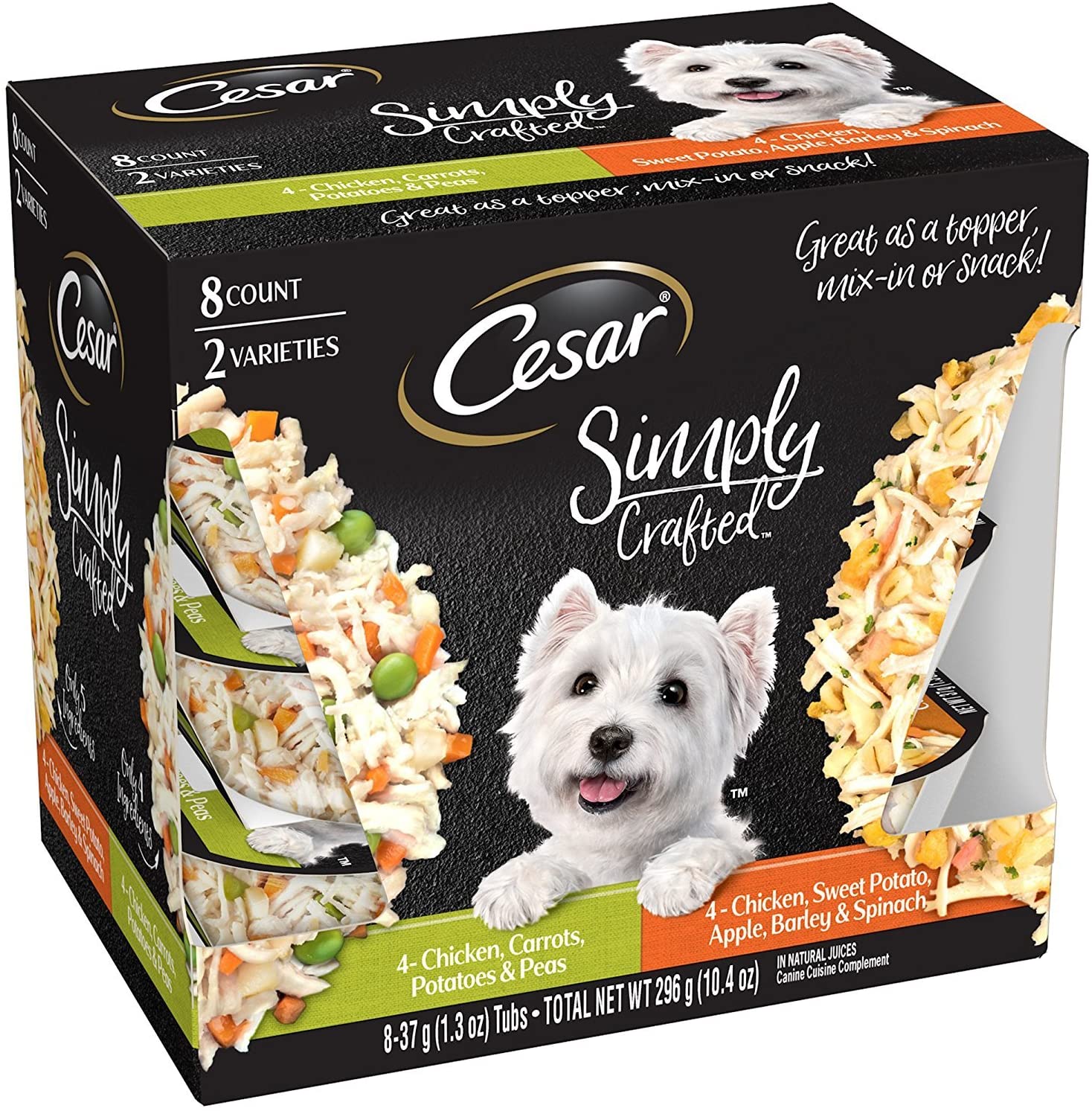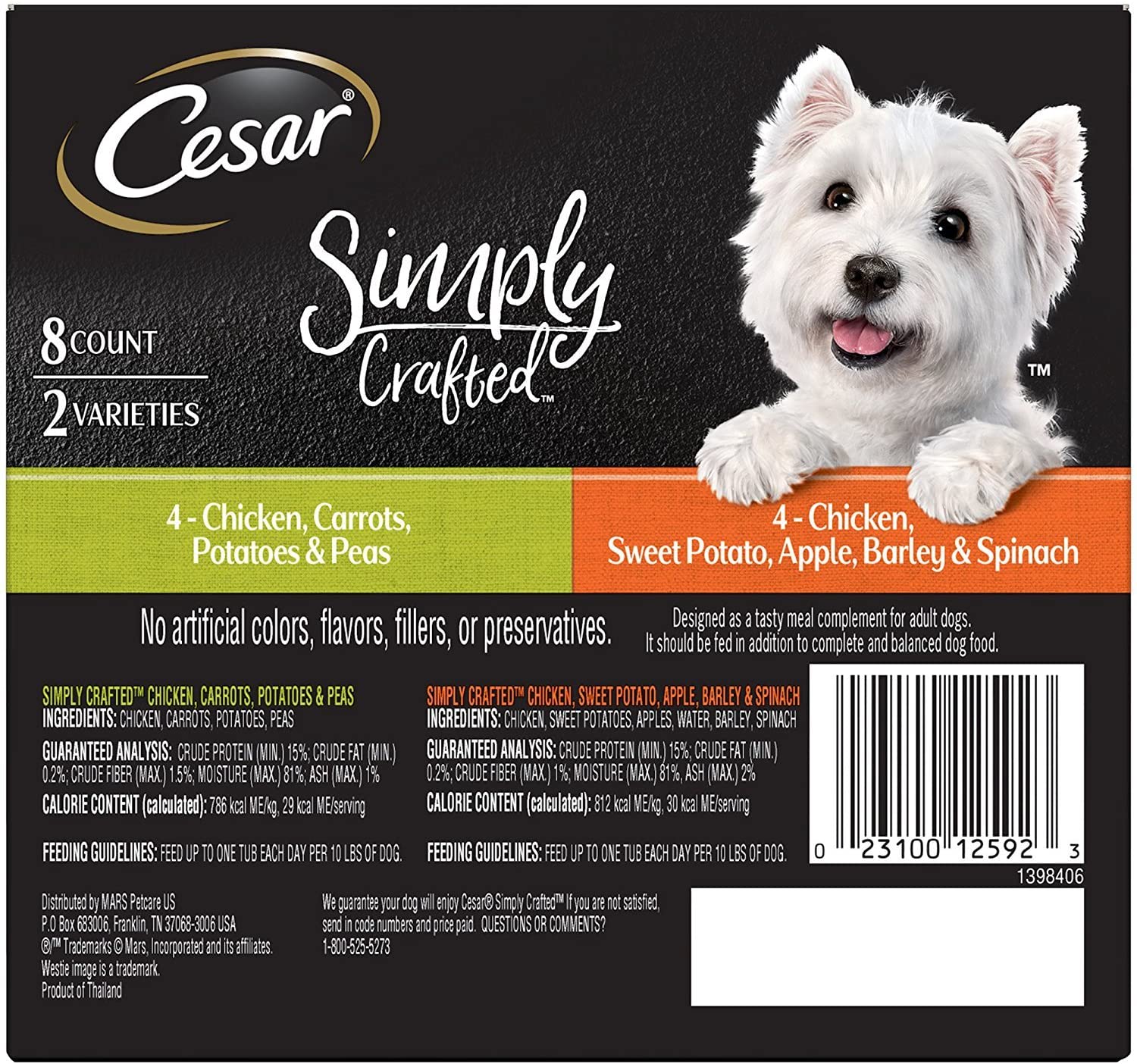 Cesar SIMPLY CRAFTED Adult Wet Dog Food Cuisine Complement Variety Pack –Chicken, Carrot, Potato and Peas, and Chicken, Sweet Potato, Apple, Barley and Spinach 1.3 Ounce Tubs (8-Pack)