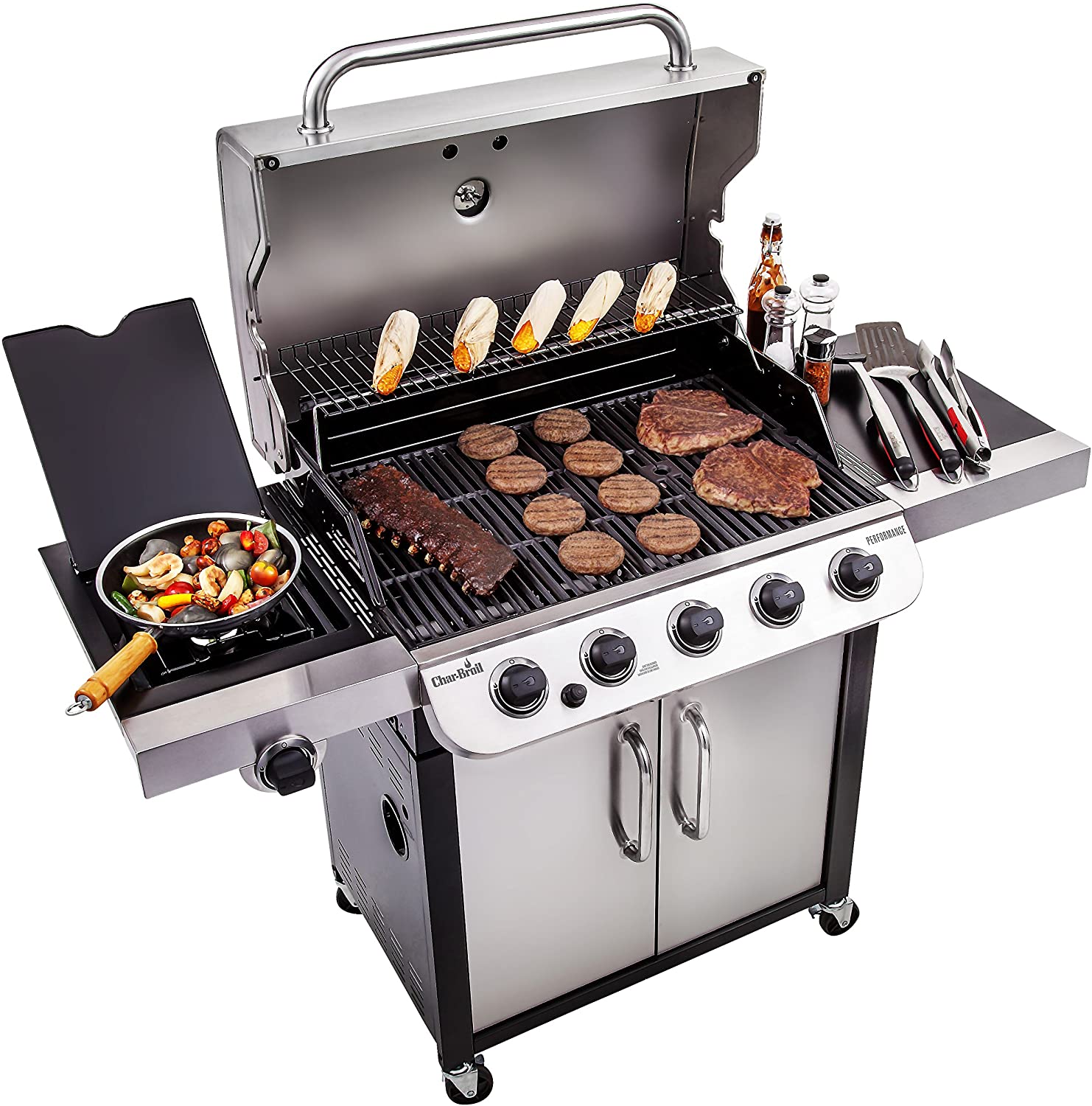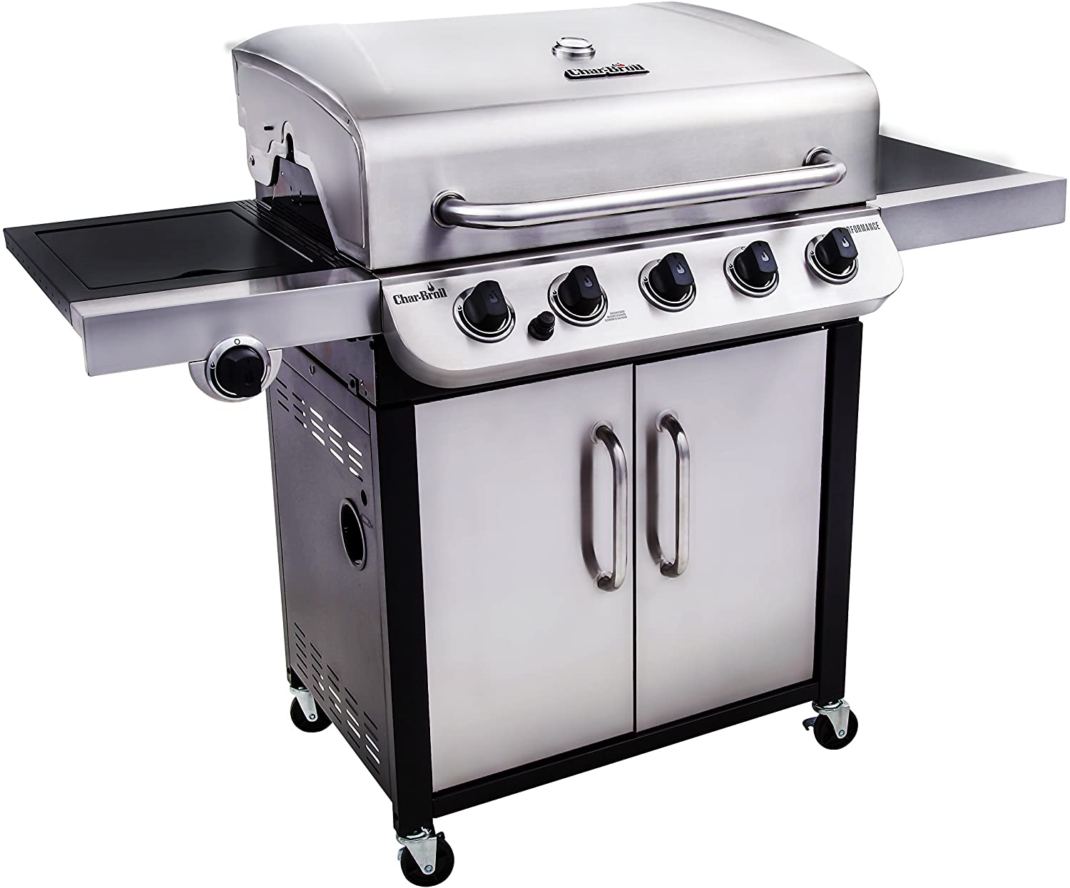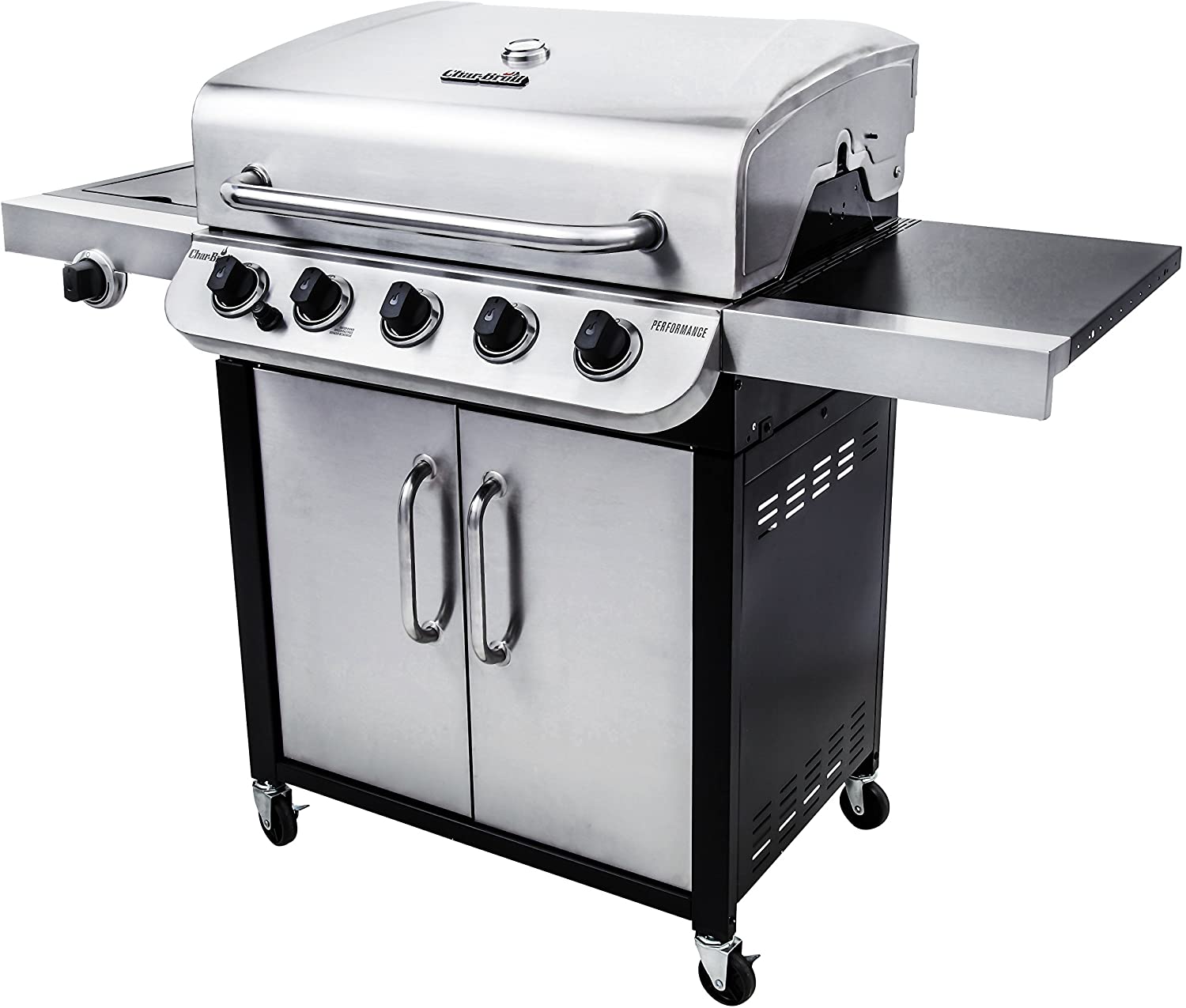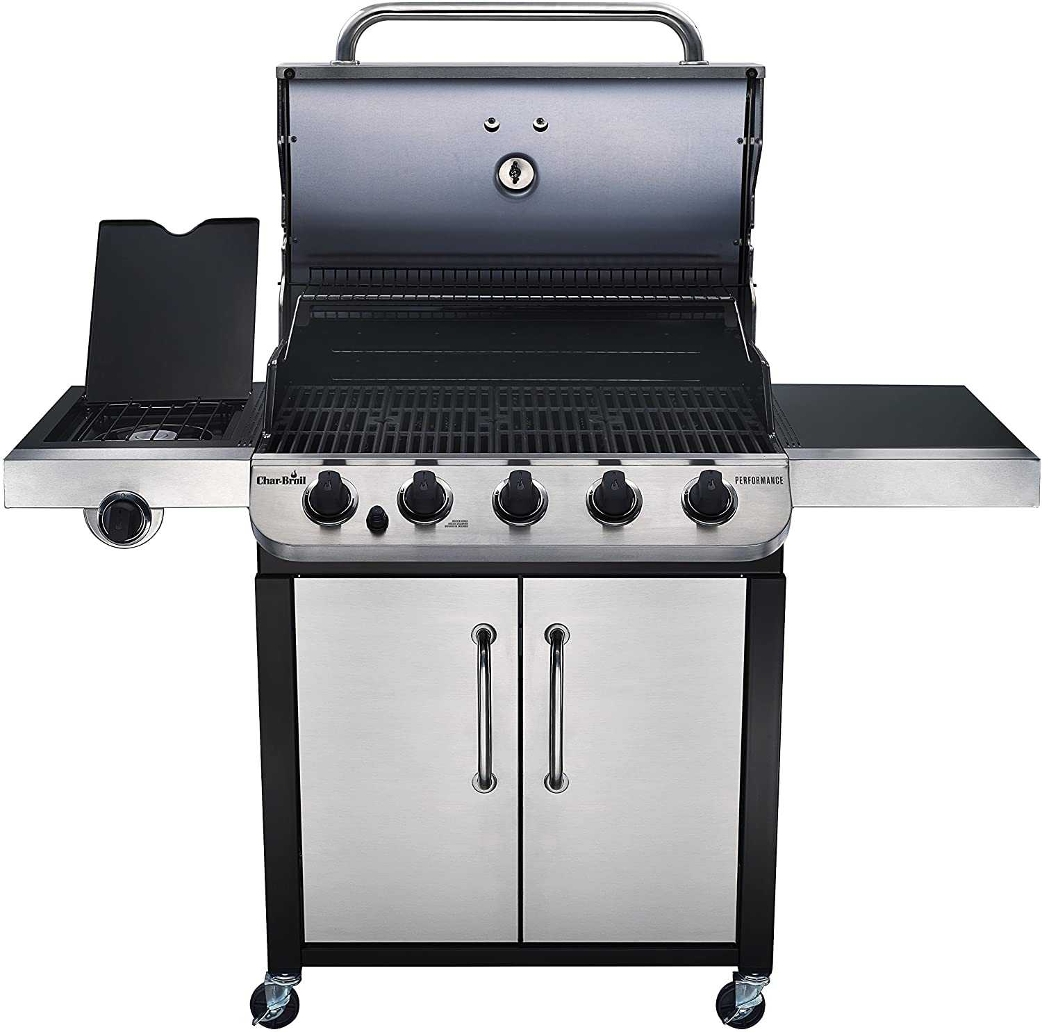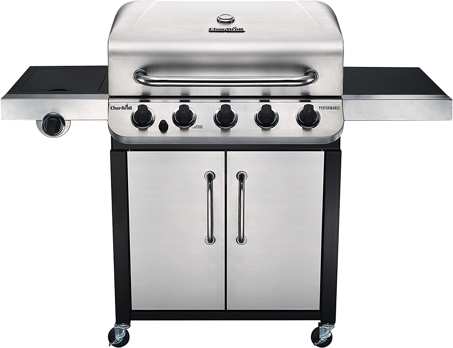 Grilling great food for family & guests made easy with the performance 550 from Char-Broil. The five stainless steel top-ported burners are built to last, & deliver 45,000-btus of heat across 550 square" of primary cooking space & the 205 square" swing-away rack. The 10,000-btu lidded side burner can be used to prepare sides or sauces, & the lid folds down to provide additional work space when not in use. Rust-resistant, porcelain-coated, cast iron grates, help prevent food from sticking & make cleaning simpler. Features a removable grease pan for easy removal & cleaning, electronic ignition for fast & reliable startups & a lid-mounted temperature Gauge for added heat control. Large metal side shelves provide ample work space & the stainless steel lid, handle & control panel provide style & durability. The performance 550 is a cabinet style grill, meaning that it sits on four casters- two of which lock- providing easy mobility, & the ability to secure once in place. Two stainless steel doors provide access to the cabinet, which can be used to store the propane tank, accessories, rubs or tools. Assembled dimensions: 56inches w x 24inches L x 45-inches H.