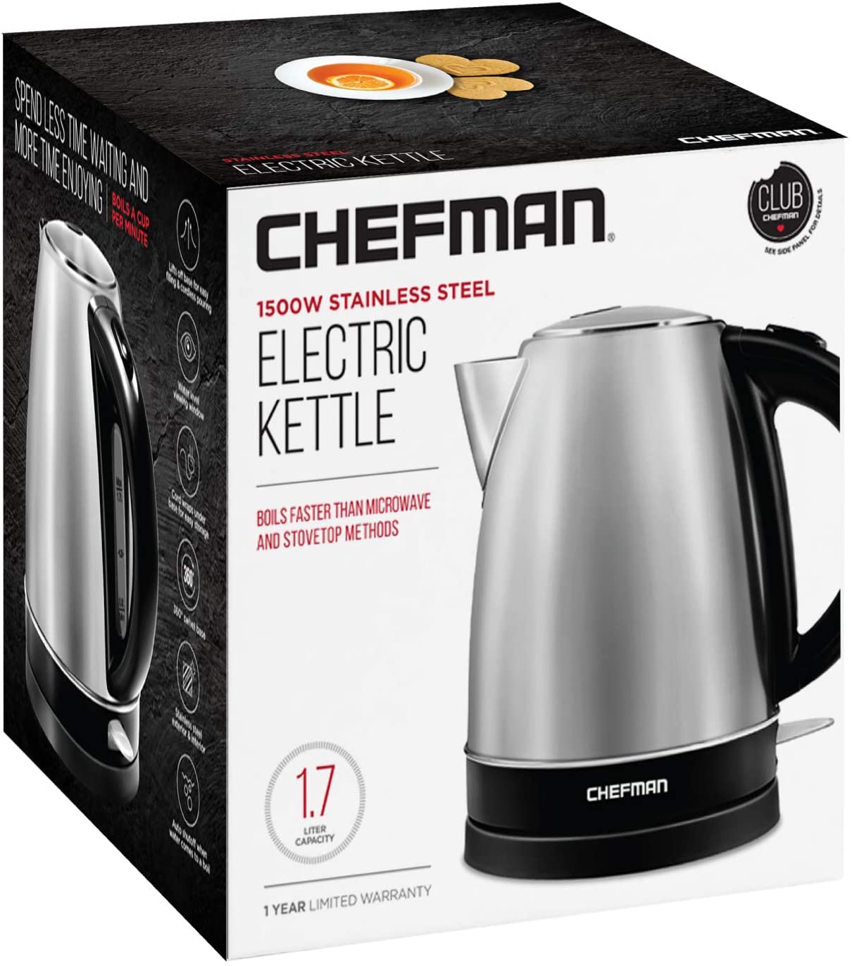 With the Chefman stainless steel cordless electric kettle you get the appeal of a classic kettle with the benefits of modern technology. Its sleek finish looks amazing in any kitchen, and boils water Significantly quicker than stovetop methods. Perfect for heating up water for anything from tea, Coffee, or hot cocoa to instant soup, oatmeal, and more! The kettle easily lifts from its swivel base for easy filling at the sink and graceful serving without the hassle of a power cord; It can also be returned to its power source from any direction, Great for right and left-handed users. For safety, the kettle shuts off automatically once the water has reached a boil - no need to worry about it boiling dry!