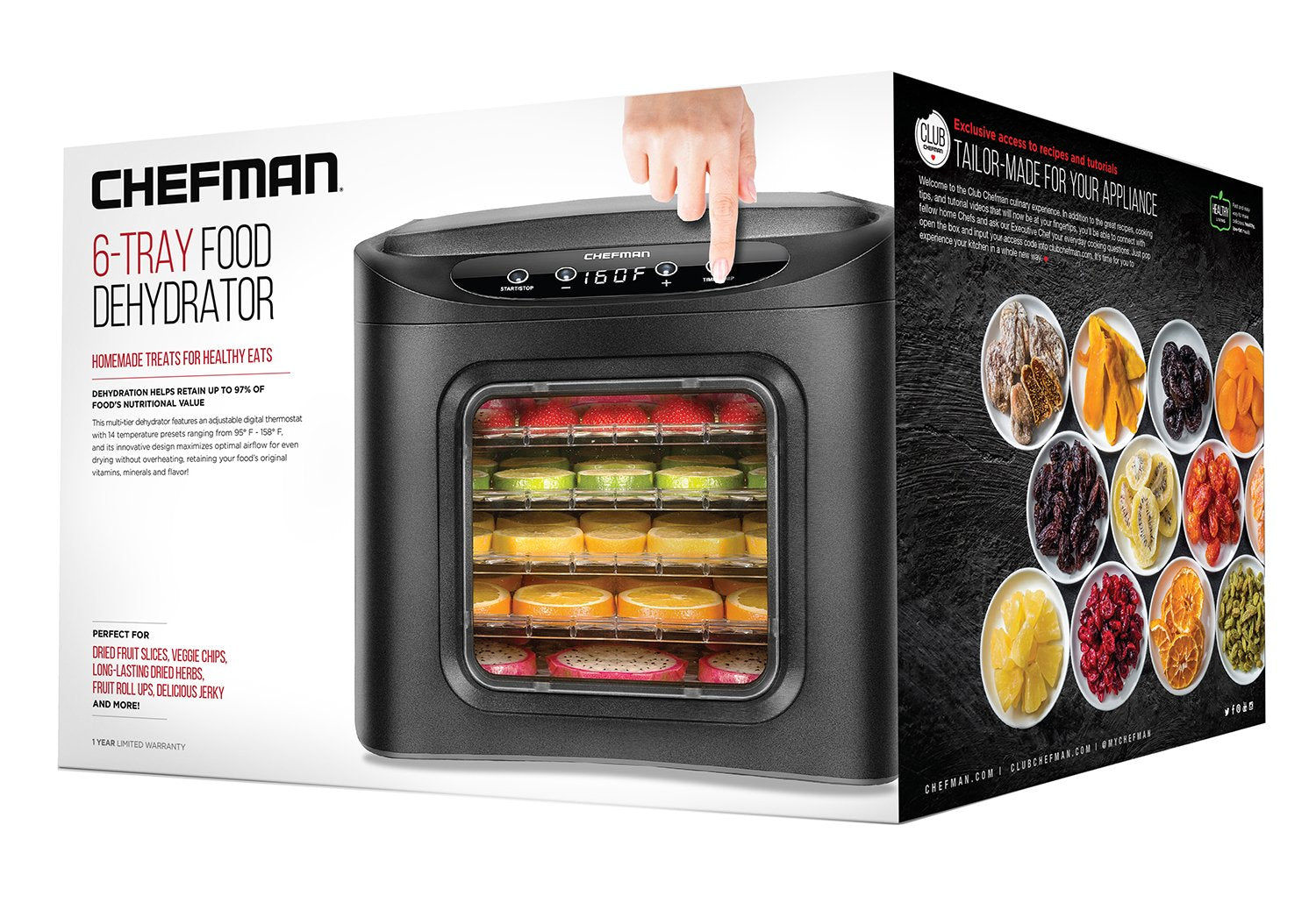 Dehydrating simplified: the Chefman Dehydrator includes 6 spacious (13"x12") adjustable BPA free plastic trays, so you can create different types of dehydrated foods in one convenient batch at a fraction of the cost of commercially dried foods. Makes for a great healthy snack and ideal for people with allergies as there are no preservatives!