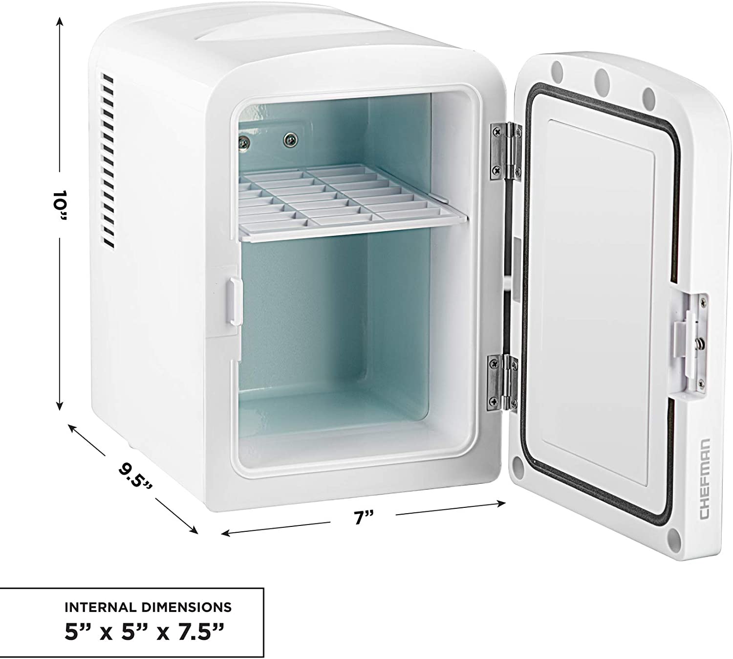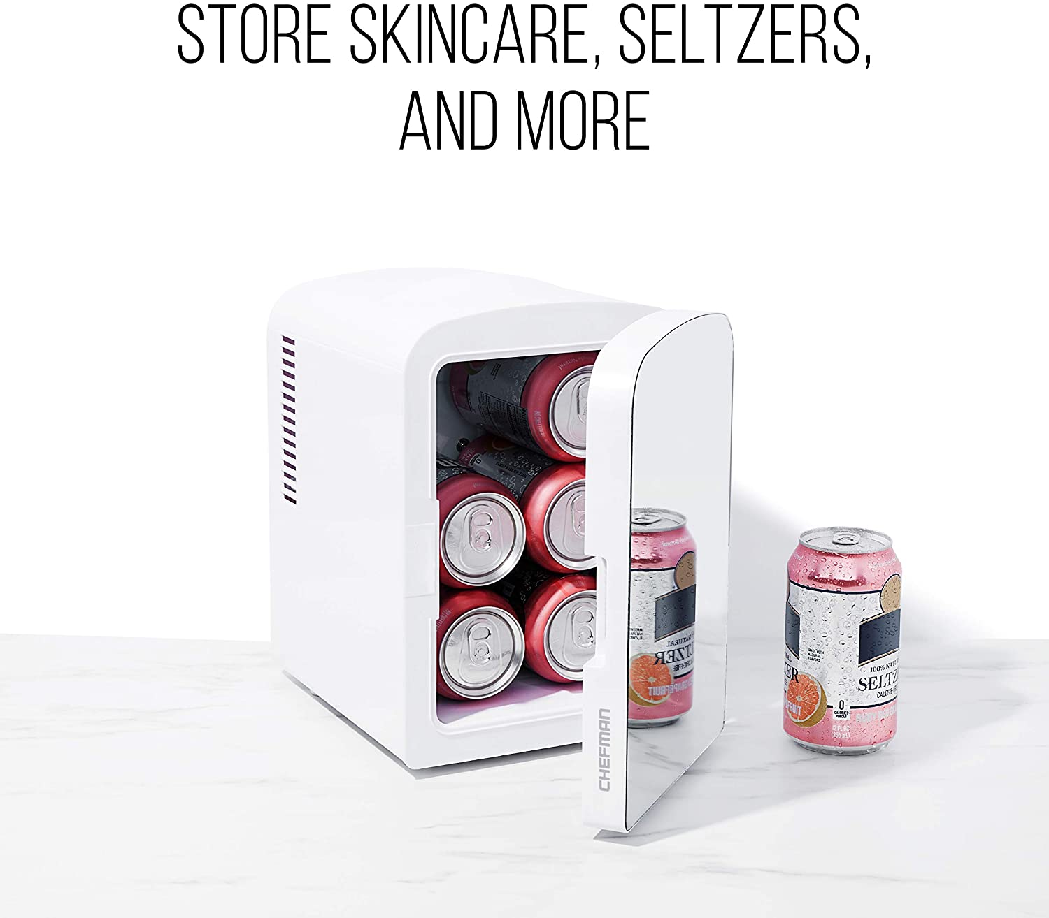 The Chefman Portable Mirrored Personal Fridge does so much more than keep food cold. Extend the life of your beauty products with this compact, desktop design. Now, perfectly temperature-controlled products don’t have to compete for space in your fridge. Enjoy the luxury of convenient storage anywhere in your home, office, dorm, or even on the go. With plugs for standard home outlets and for car chargers, the beautiful design and unparalleled convenience of this Personal Fridge is totally portable. Simply flip a switch to change from cool to warm to keep your heated essentials hot all day long. Perfect for your morning coffee and even for storing your lunch at work. Plus, the mirrored door adds a sophisticated design element to help make your space shine. Makeup application, storage, and preservation is simplified with this all-in-one beauty device. Fit up to six of your favorite 12 oz. canned beverages for a refreshing drink any time or keep the Personal Fridge in a nursery to save trips to the kitchen and time heating up milk. From your morning skincare routine, to your busy workday, on your car ride home, and in your bedroom at night, enhance every day with the perfect item for you.