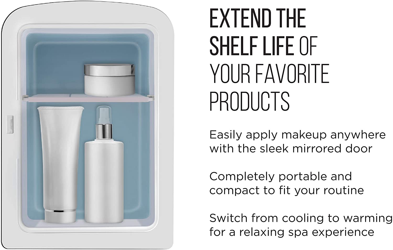 - MAKEOVER YOUR DESK: Compact design is perfect for storing your essentials at home, at work, in a dorm, or even on the go. The chic color and mirrored door add an extra design flare to any space. Mirrored door makes this personal fridge the ideal accessory for your morning routine