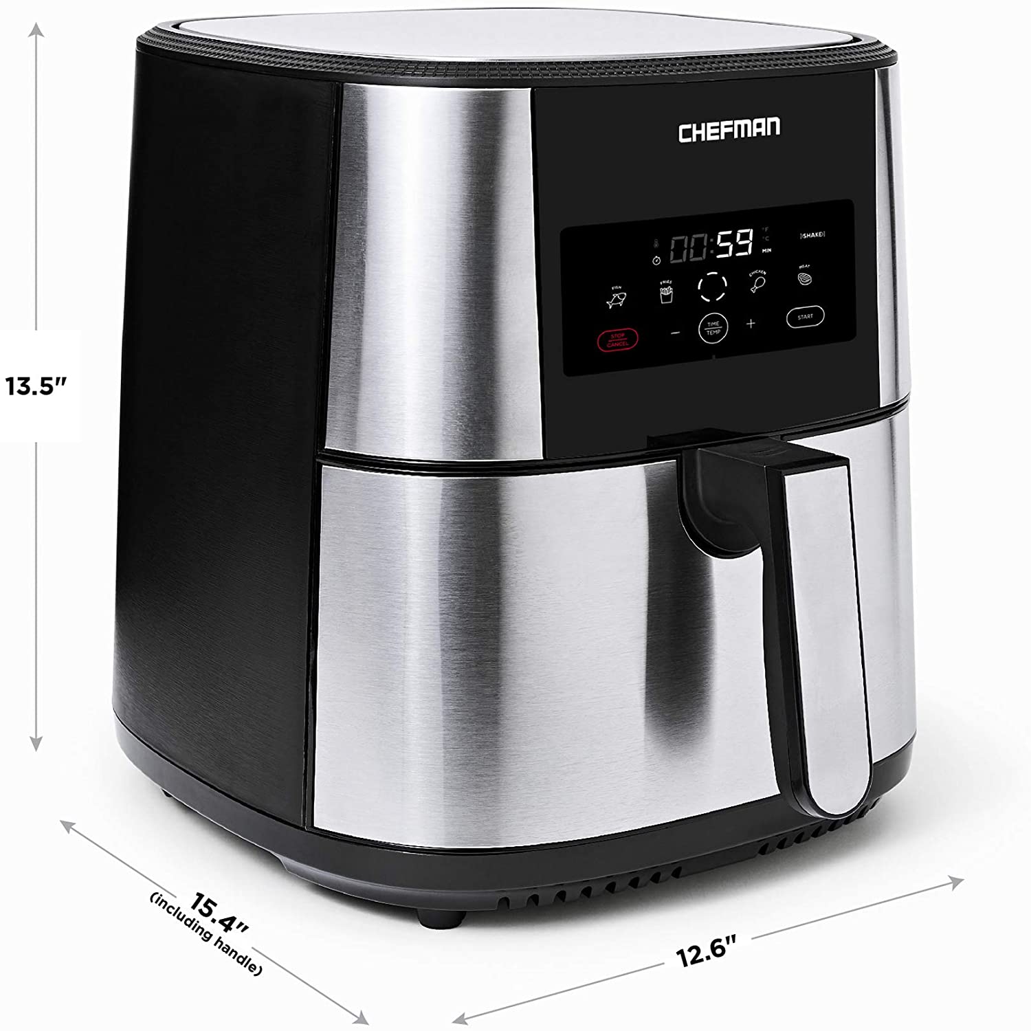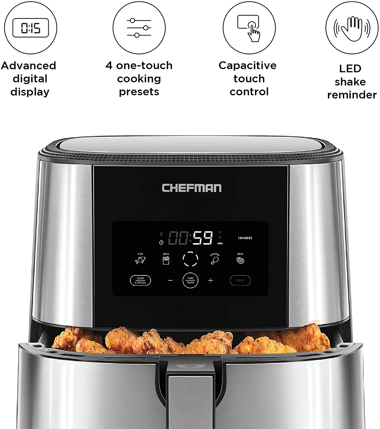 Enjoy all of the fried foods you love, with little to no oil at all! The Chefman 8 Quart TurboFry Air Fryer with Square Stainless Steel design allows you to fry like a pro right in your kitchen. With this airfryer, delicious and healthy eating is finally possible, with no mess from fried oil and less fat in your meals. The XL, family-sized capacity and nonstick basket give you the ability to cook enough for a crowd without taking up too much room on your countertop. Skip the microwave, reheat leftovers to perfection in your Chefman air fryer to bring back that crunchy, fried flavor days later. Make better-for-you fries that are just as crispy and tasty, roast chicken thighs, or heat up leftovers for a quick and easy meal. Use the helpful presets to serve fries, chicken, meat, or fish at the push of a button. The adjustable temperature control with 60-minute timer automatically shuts off once food is done, so you never have to worry about burning or drying out your food. Control both time and temperature with the simple touch screen and create evenly cooked meals with help from the LED shake reminder. The fryer’s space saving basket is removable and dishwasher safe for easy clean-up, so can spend more time eating than cooking!