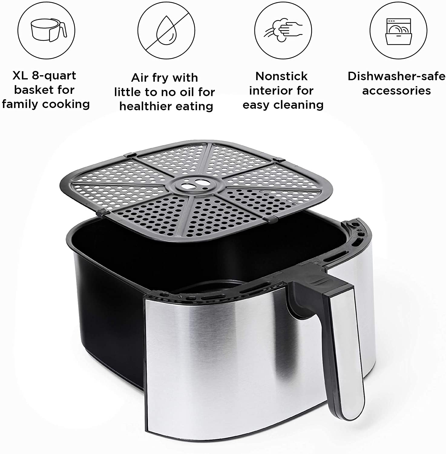 - ELEVATE YOUR COUNTERTOP: With the sleek, square shape and nonstick stainless steel finish, this air fryer was designed with your kitchen counter in mind. The compact, easy to store build makes this the ideal fryer for families with big appetites and limited counter space. The dishwasher safe basket allows for easy cleaning and quick storing, saving space on your counter; perfect for any small kitchen, dorm, office, RV, and more!