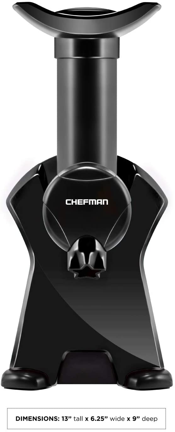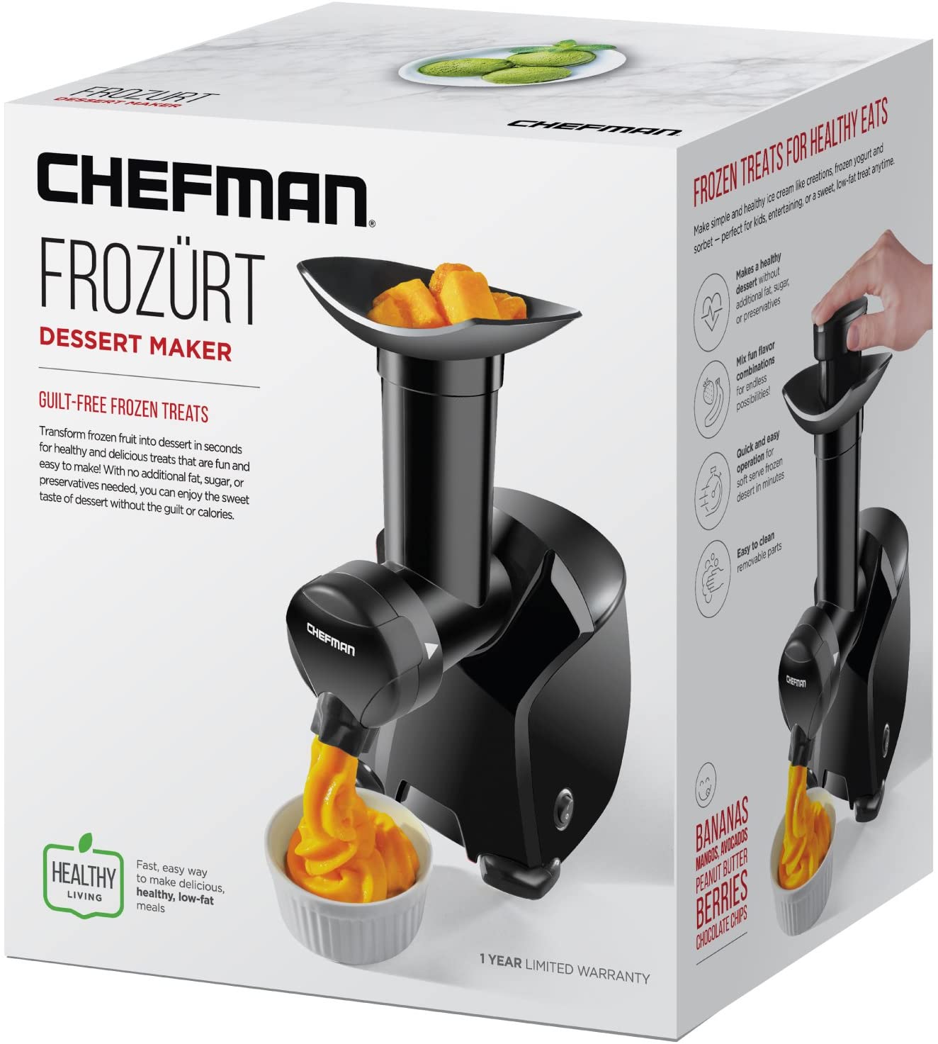 The Chefman Frozurt Dessert Maker transforms frozen fruit into dessert in seconds for healthy and delicious treats that are fun and easy to make! Makes simple and healthy creations, such as frozen yogurt and sorbet - with no additional fat, sugar, or preservatives needed, you can enjoy the sweet take of dessert without the guilt or calories.