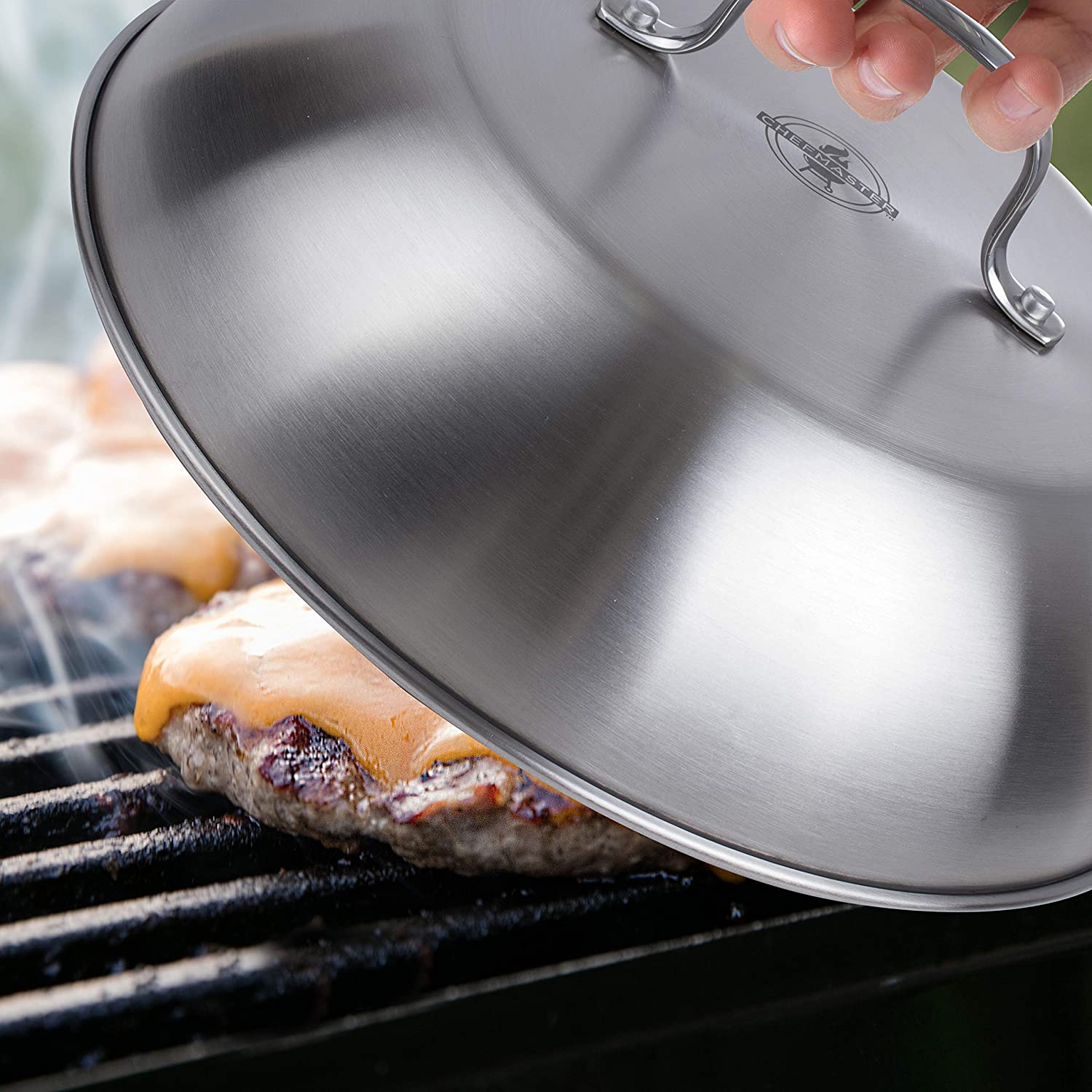 - RELIABLE CUTTING-EDGE ENGINEERING: Manufactured with a durable stainless-steel construction and a sleek handle riveted firmly in place, this rugged grilling dome features a vault-like arch design that measures 9" x 9" x 5" and weighs a solid 15.8 ounces.