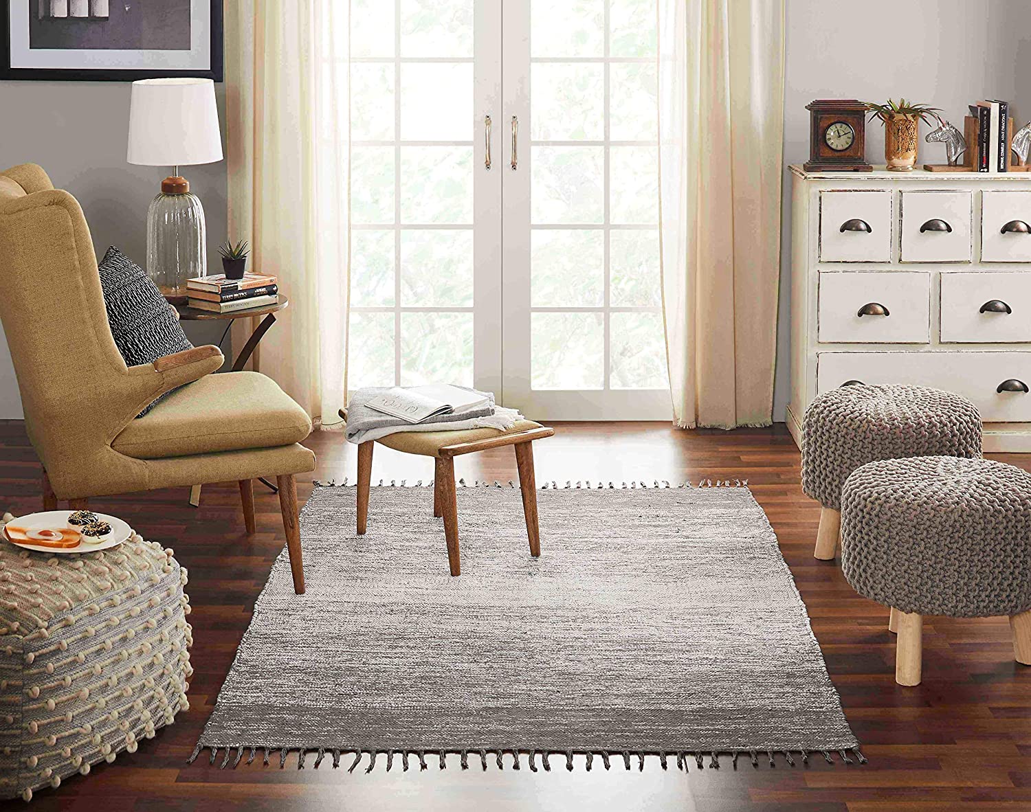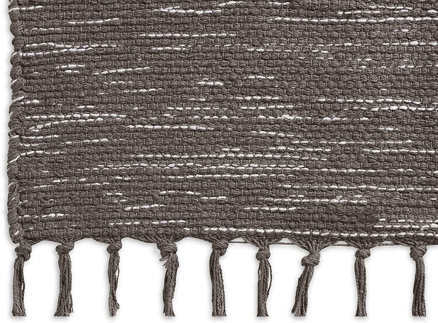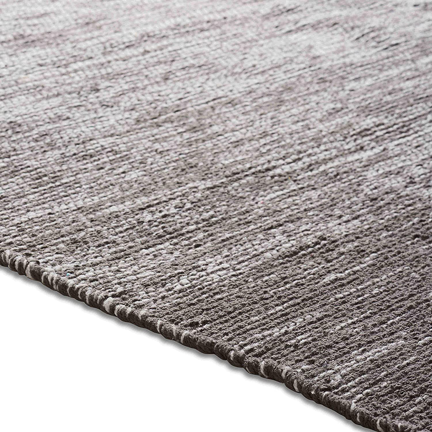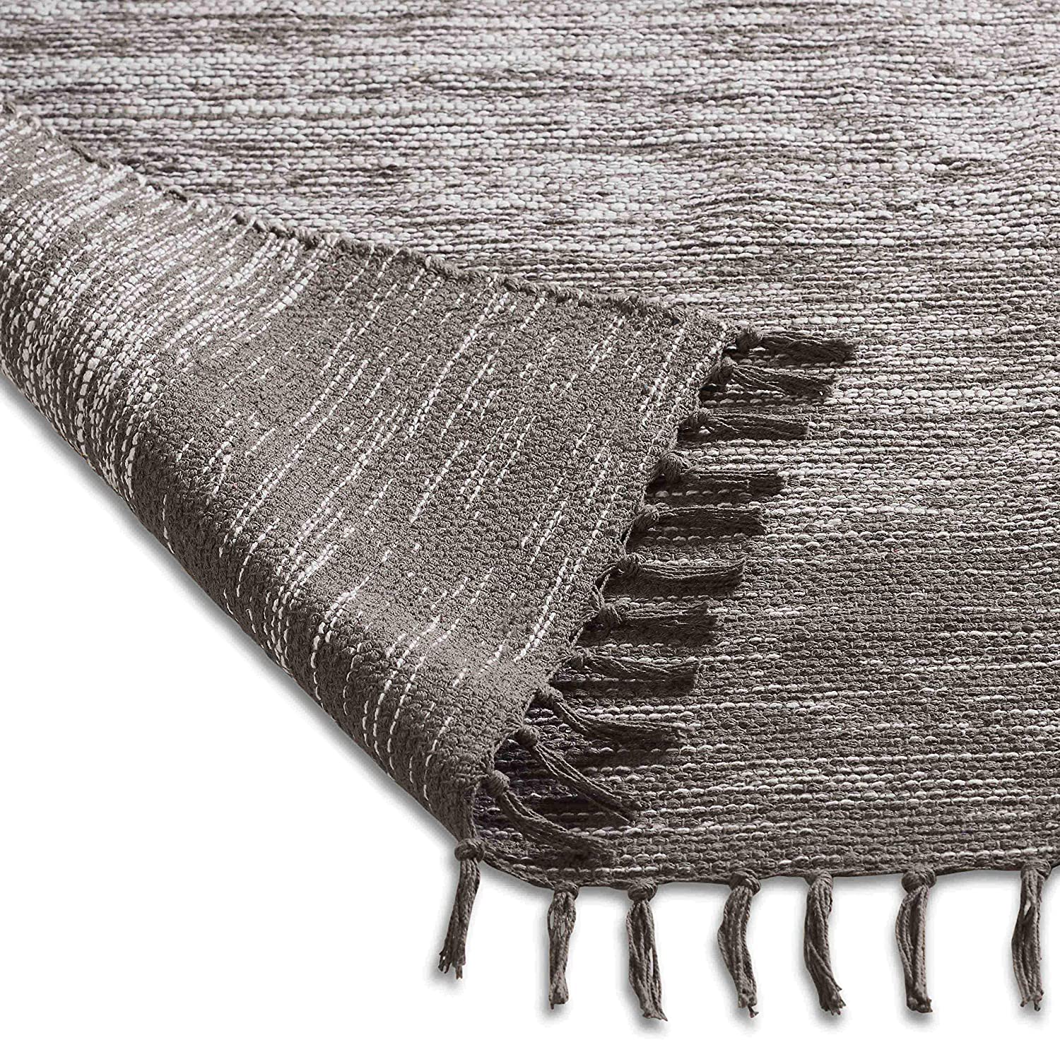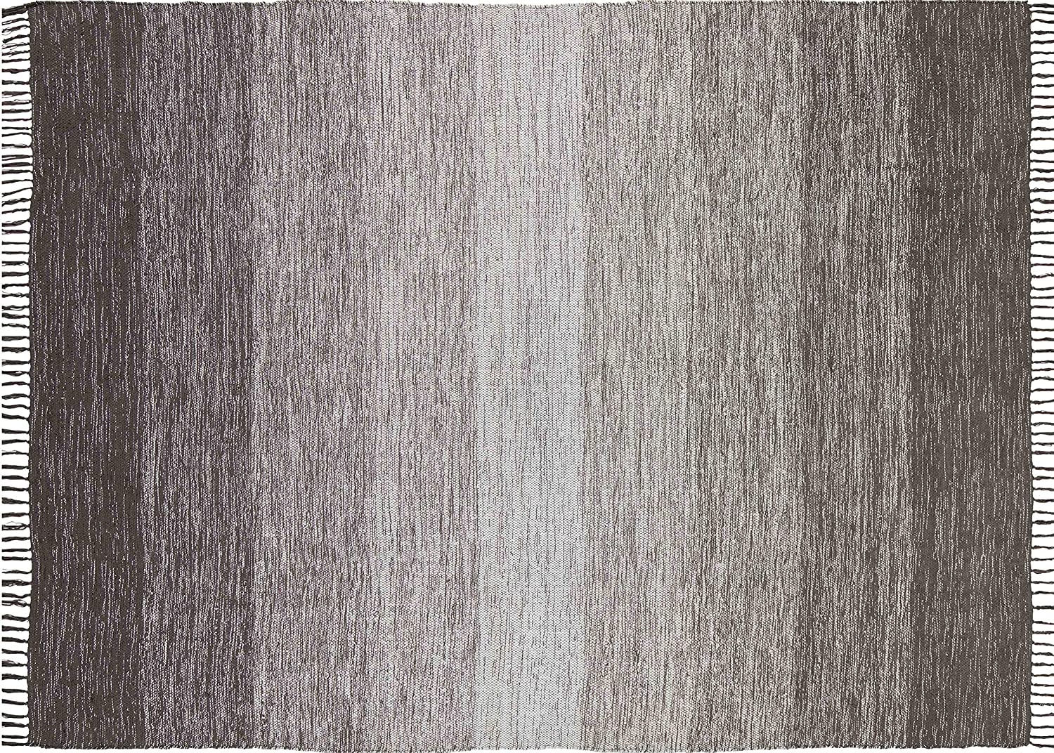 Bring the look of gradient color and warmth into your living space with this beautiful hand-woven Ombre area rug. The lightweight, flat-weave design of this grey area rug is made of 100% cotton. The fringe detail adds a delicate finish to this large grey area rug. The slightly distressed Ombre effect, paired with lovely hues, adds just the right touch of modern design to your home style. The reversible design of this fringed area rug has the same pattern on both sides. The black and grey tones in this Ombre area rug can complement any design color scheme. Best paired with a non-slip rug pad (not included).