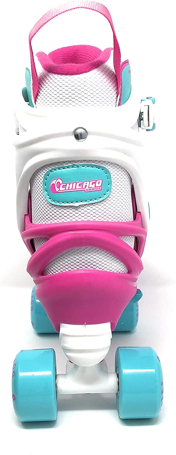 • SPECIFICS: Pink/White/Teal. Adjustable youth size Small (J10 -J13). Chicago Skates - the leading brand in the skating industry for over 100 years. Includes a 30-day manufacturer's warranty.