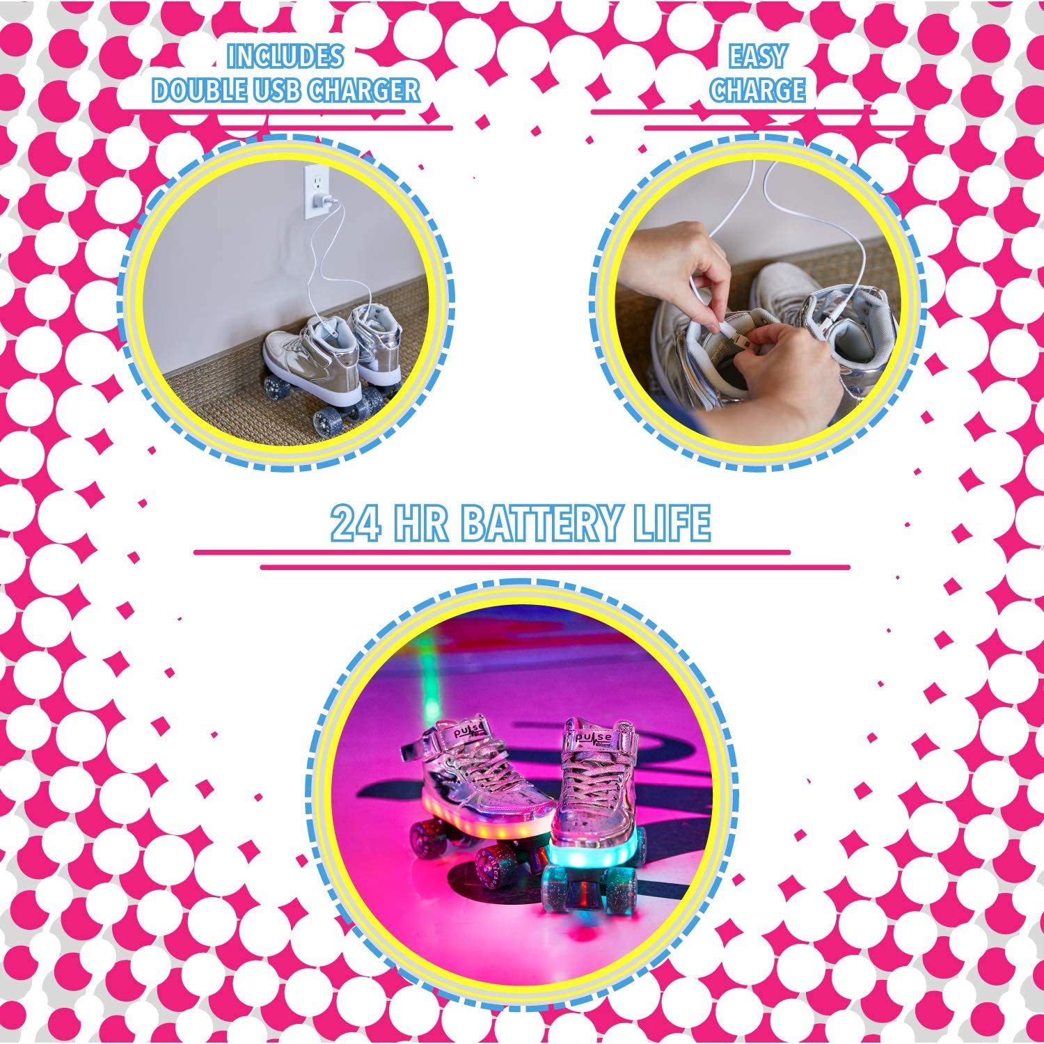 • LIGHT-UP SKATES: Roll in style with the new Pulse Light-Up Skates by Chicago Skates. Stylish quad skates with high-top sneaker design and flashing rechargeable LED lights in the outsole.