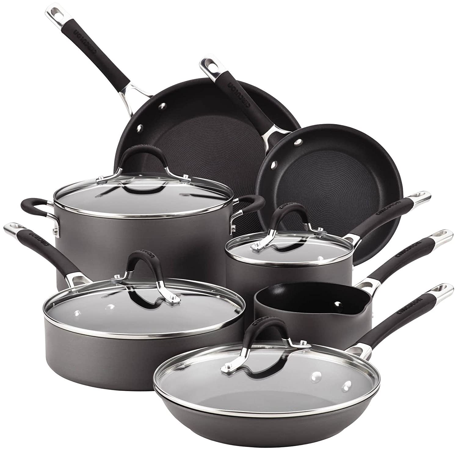 - Set Includes: 1-qt. open pouring saucepan; 2-qt. covered saucepan; 6-qt. covered stockpot; 3-qt. covered saut=; 10" covered skillet; 8.5" and 11.5" open skillets