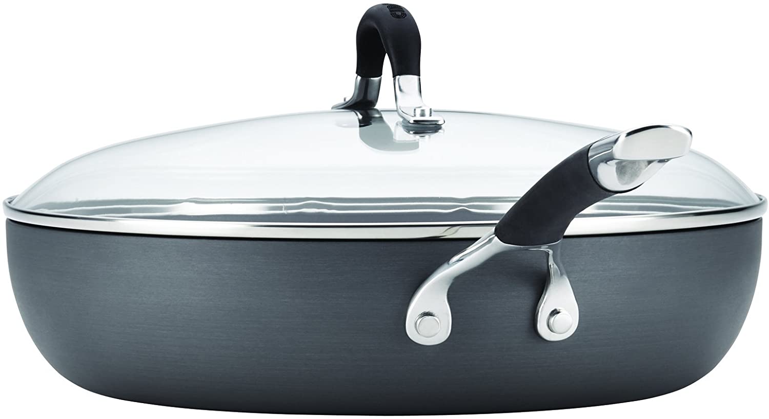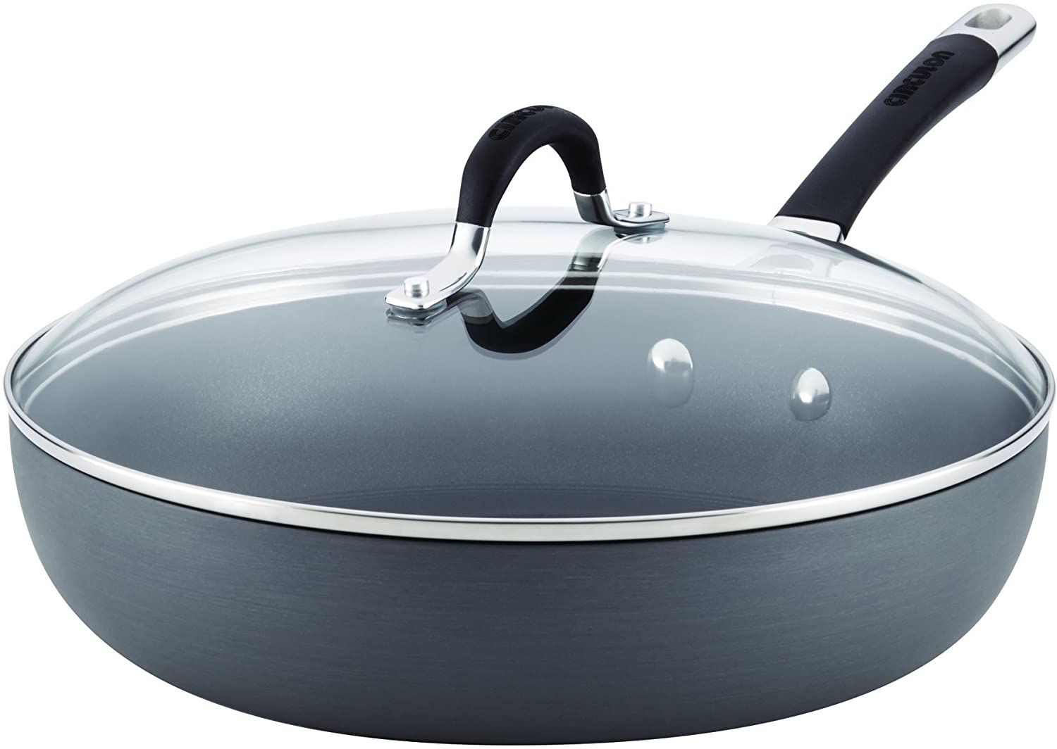 Stovetop single-pan cooking rises to new levels of performance and convenience, with the efficient, dishwasher safe Circulon Momentum Hard-Anodized Nonstick 12-Inch Covered Deep Skillet. Engineered to deliver time- and energy-saving kitchen solutions, Circulon Momentum combines durable hard-anodized aluminum cookware construction with superior nonstick technology. This large covered skillet features the patented TOTAL Nonstick System, combining top-quality PFOA-free metal utensil safe nonstick with raised circles on the cookware interior to reduce abrasion throughout the cooking process. Heavy-duty hard-anodized aluminum construction promotes fast, thorough heating, perfect for searing, browning, and sauteing. The pan's additional depth and the shatter-resistant glass lid provide ample room and coverage for one-pan meals. A stain-resistant, dishwasher safe exterior adds style and functionality, and the deep skillet is oven safe to 400°F for stove-to-oven cooking versatility. The stainless-steel-and-silicone handle provides comfortable, confident handhold even with a filled pan, and is dual-riveted for added support. Suitable for all stovetops except induction, Circulon Momentum Hard-Anodized cookware includes a Hassle-Free Lifetime Guarantee. From quick weeknight cooking to weekend meals, the spacious, versatile Circulon Momentum Hard-Anodized Nonstick 12-Inch Covered Deep Skillet delivers perfect cooking on the stove, and easy cleaning in the dishwasher.