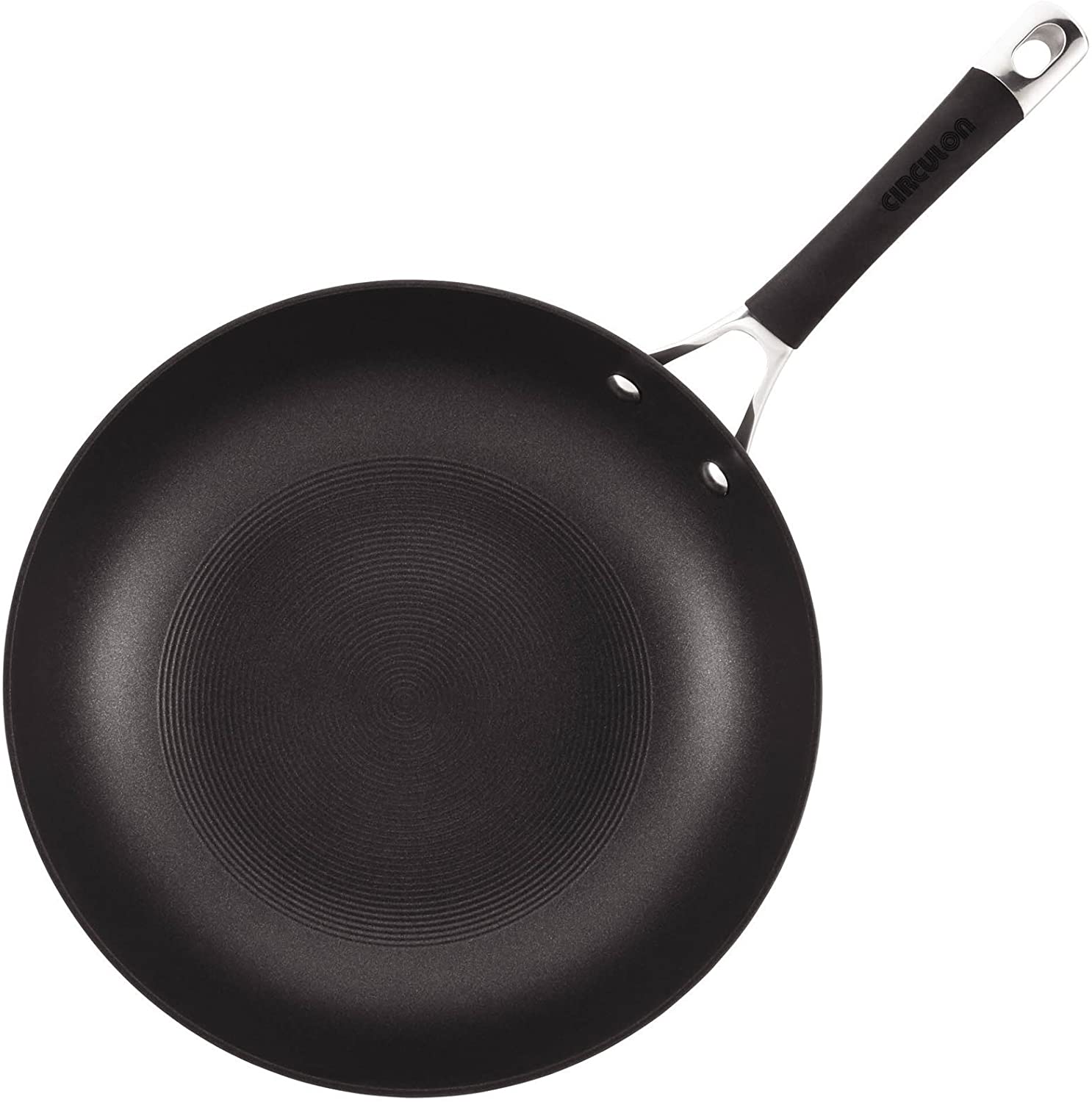 Tossing and turning is a quick and easy task in the kitchen, with the high-efficiency, dishwasher safe Circulon Momentum Hard-Anodized Nonstick 12-Inch Stir Fry Pan. Designed to deliver energy- and time-saving cooking solutions, Circulon Momentum combines durable hard-anodized aluminum cookware construction with superior nonstick technology. This stir fry pan features the TOTAL Nonstick System, combining top-quality PFOA-free metal utensil safe nonstick with raised circles on the interior. This patented nonstick system reduces abrasion from utensils as crunchy veggies, marinated meat or poultry and other tasty ingredients are tossed and stirred, helping to ensure long-lasting stir fry performance. Solid-gauge hard-anodized aluminum construction promotes the fast, thorough heating essential in a quality stir fry pan, and the stain-resistant, dishwasher safe exterior adds versatility and functionality. The stainless-steel-and-silicone handle provides confident, comfortable grip, and is dual-riveted for added support. Oven safe to 400°F and suitable for all stovetops except induction, Circulon Momentum Hard-Anodized cookware includes a Hassle-Free Lifetime Guarantee. East meets West with gourmet-quality dishwasher safe nonstick performance, with the Circulon Momentum Hard-Anodized Nonstick 12-Inch Stir Fry Pan, for easy and delicious wok-style dishes.