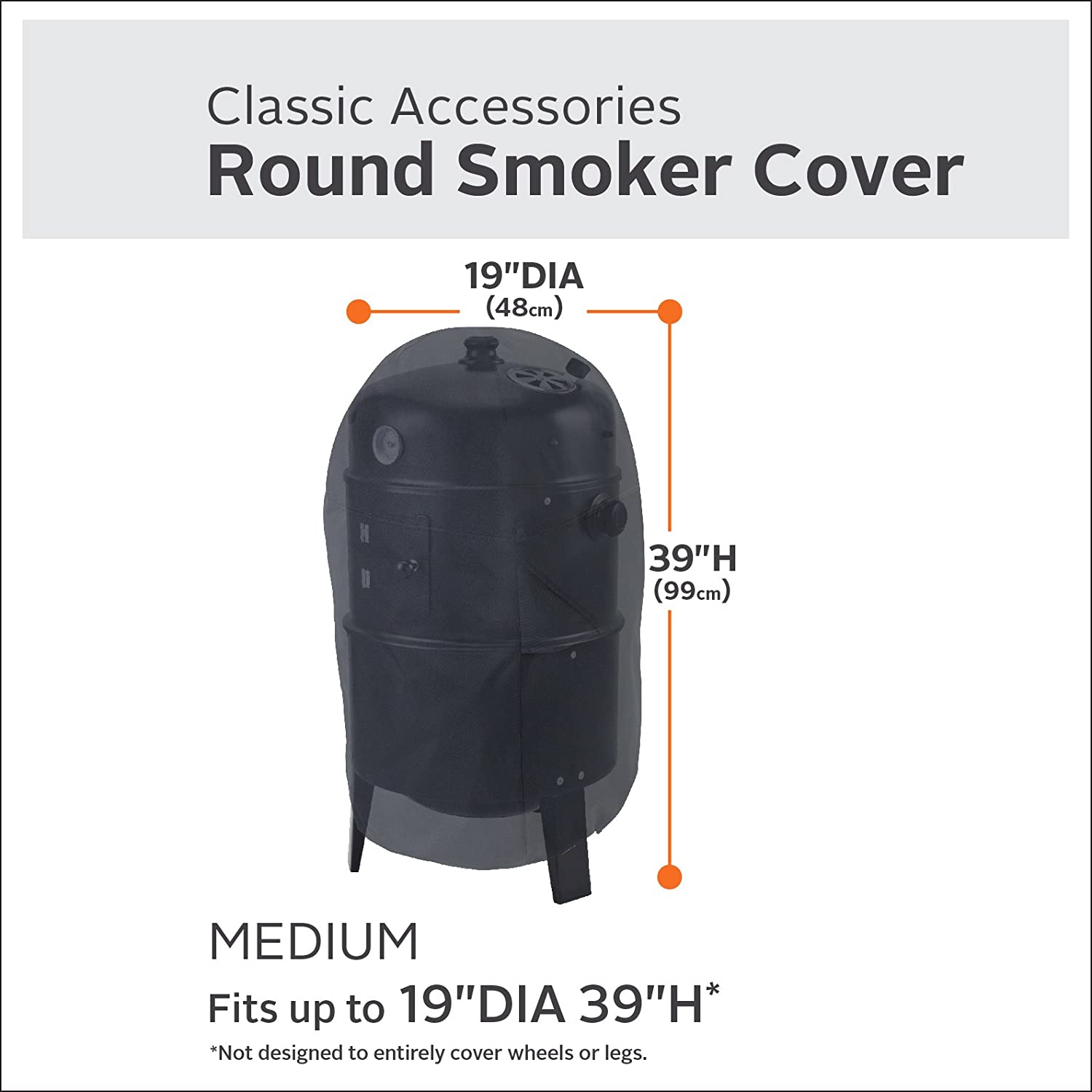 For Round Smokers Up To 19"Dia 39"H. 1 year manufacturer's . Stay On elastic loops fit over legs to keep cover on during high winds and breezy conditions. Air vents reduce condensation and wind lofting.