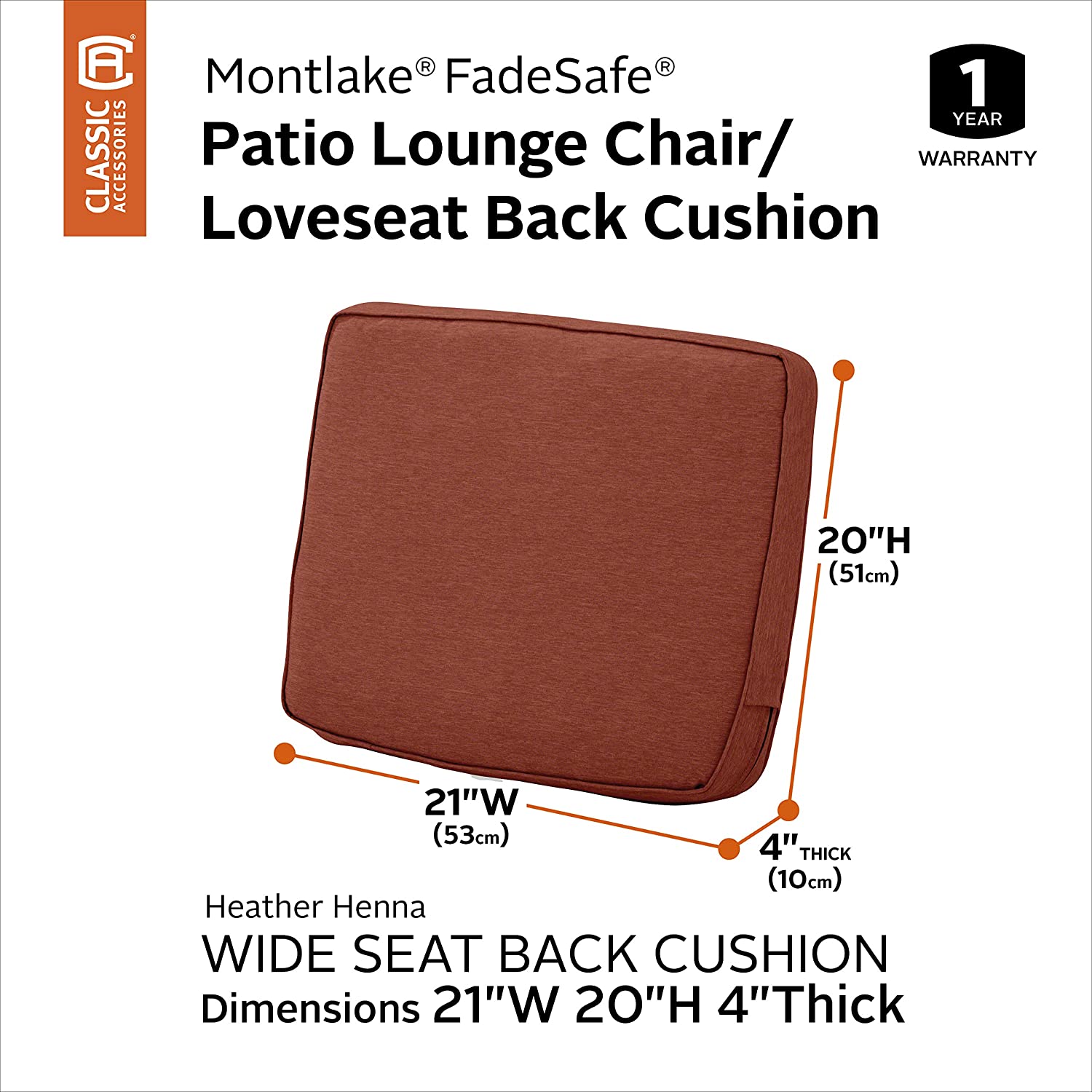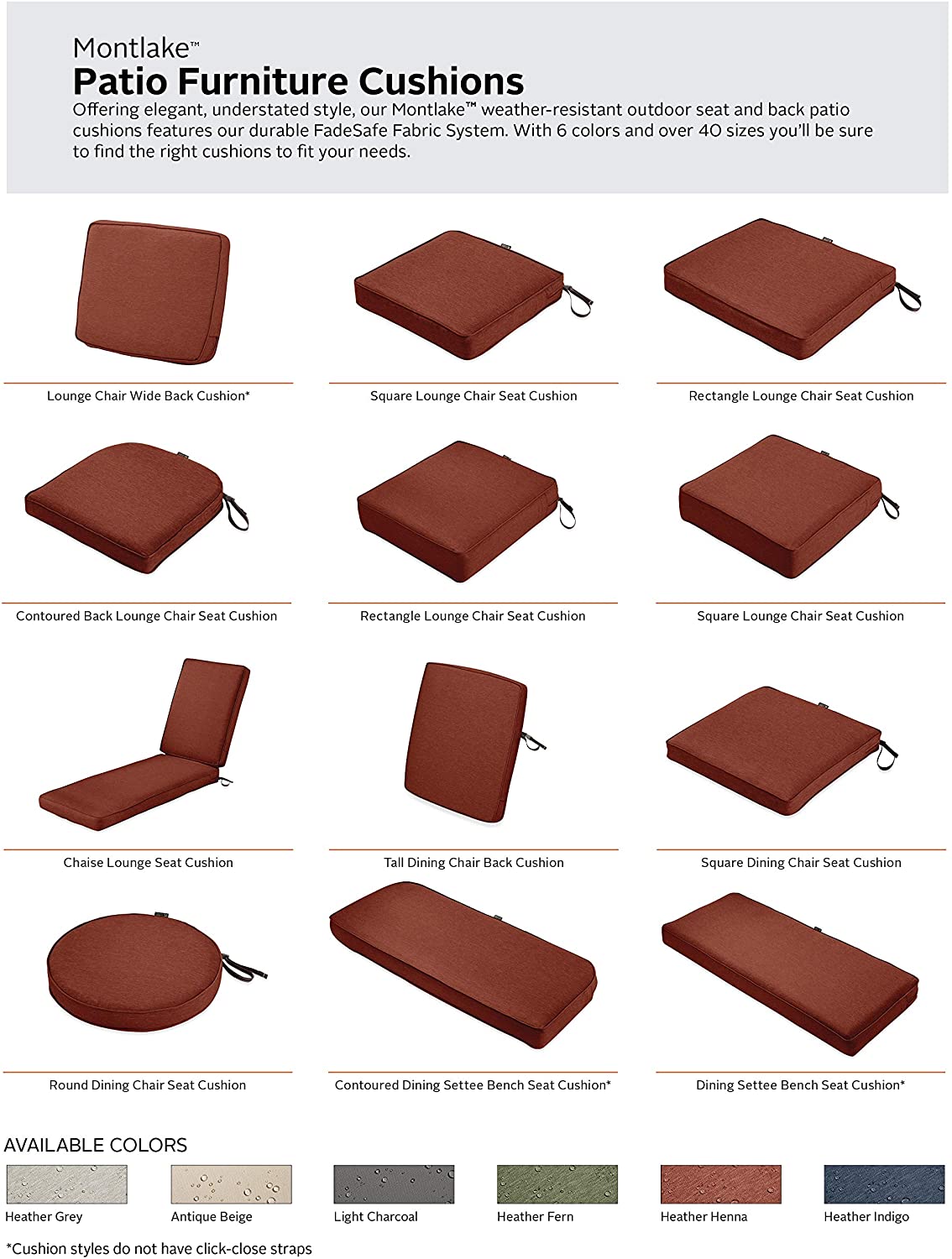 Classic Accessories Montlake Cushion Collection is offered in multiple colors and sizes and is made with Fade Safe solution-dyed fabric to ensure that colors last in all conditions. Montlake Fade Safe fabric uses a high-denier polyester to give you maximum comfort and lasting performance. High-quality foams use a dense core with a softer outer layer to provide just the right amount of give for a firm but comfortable surface. These cushions provide a fashion-forward look with durable materials to make your patio space appealing and inviting whenever you want to go outdoors. When you buy a Classic Accessories patio cushion you are not just getting a cushion; you're also purchasing lasting comfort and peace of mind. Not only will your patio cushions be protected from the elements, but you'll be protected with the easiest warranty in the industry. If your patio cushion fails within the warranty period, look for us online and take advantage of our Hassle-Free warranty program supported by our US-based customer service team.