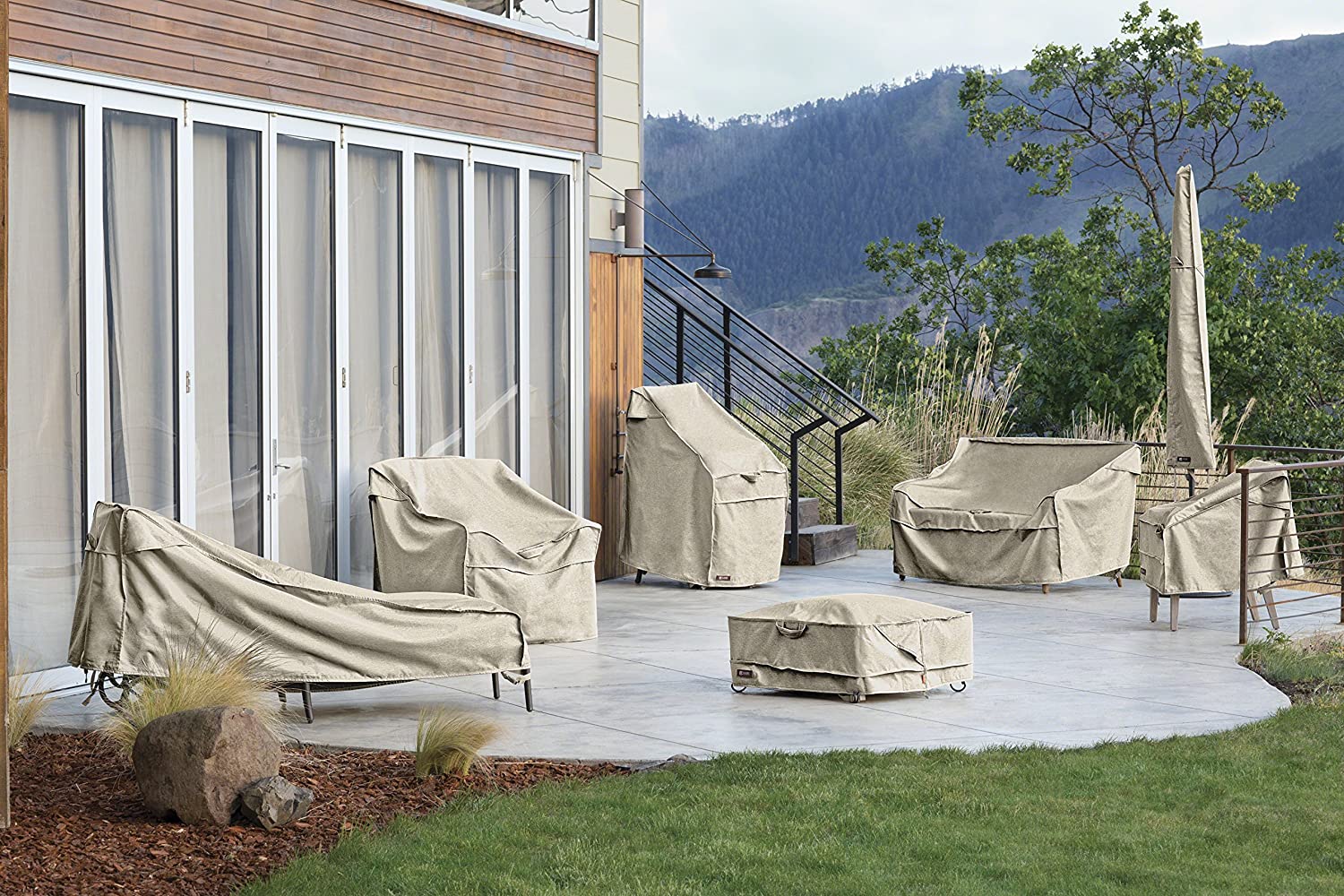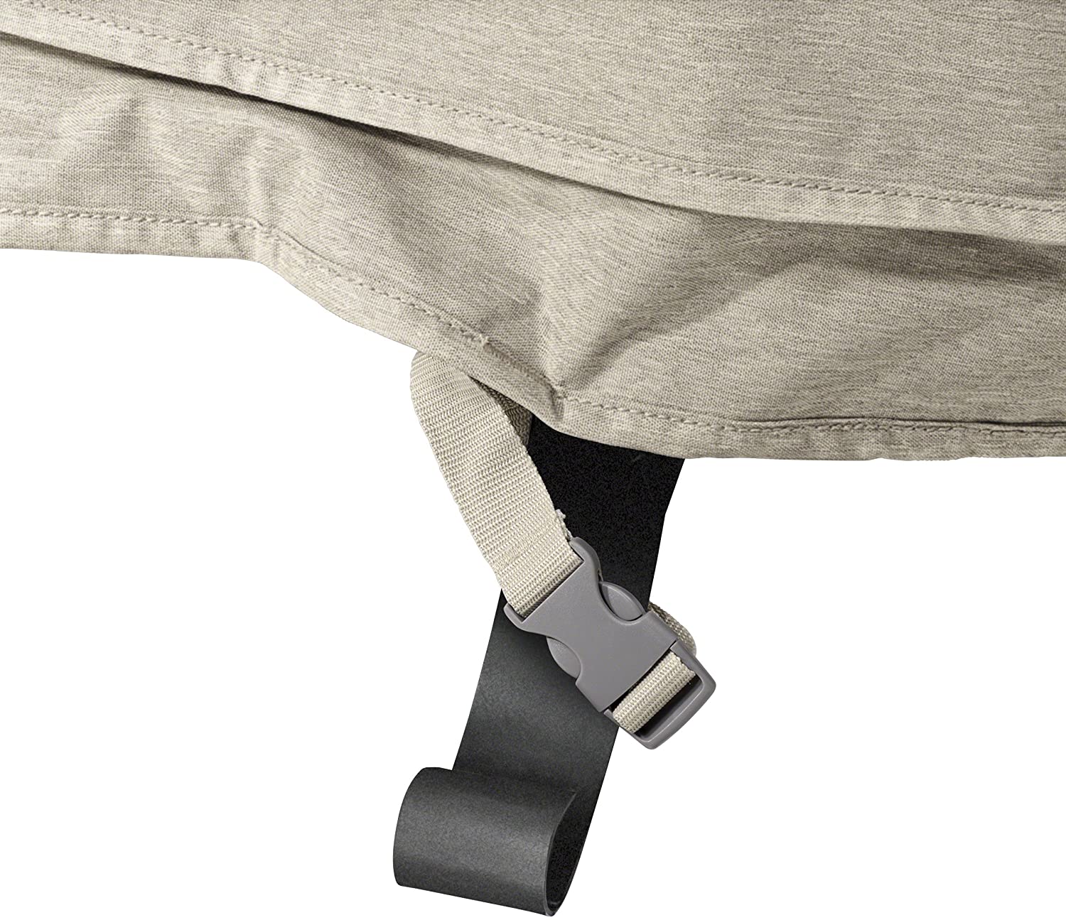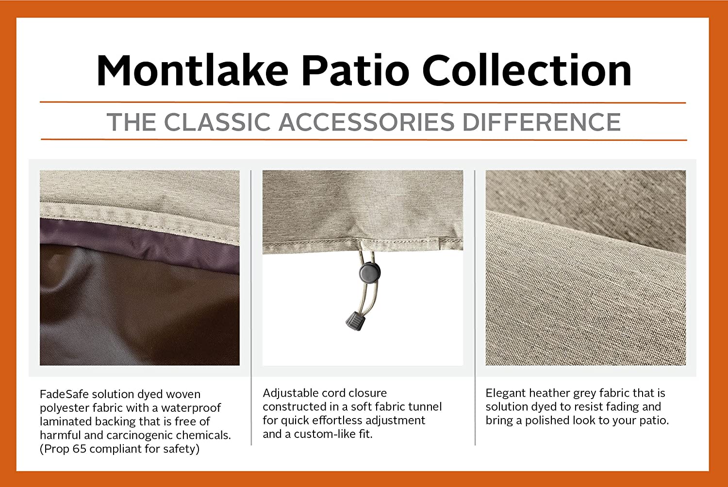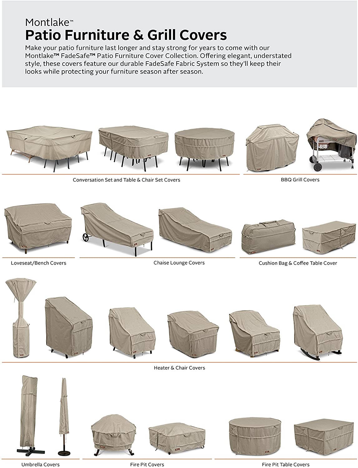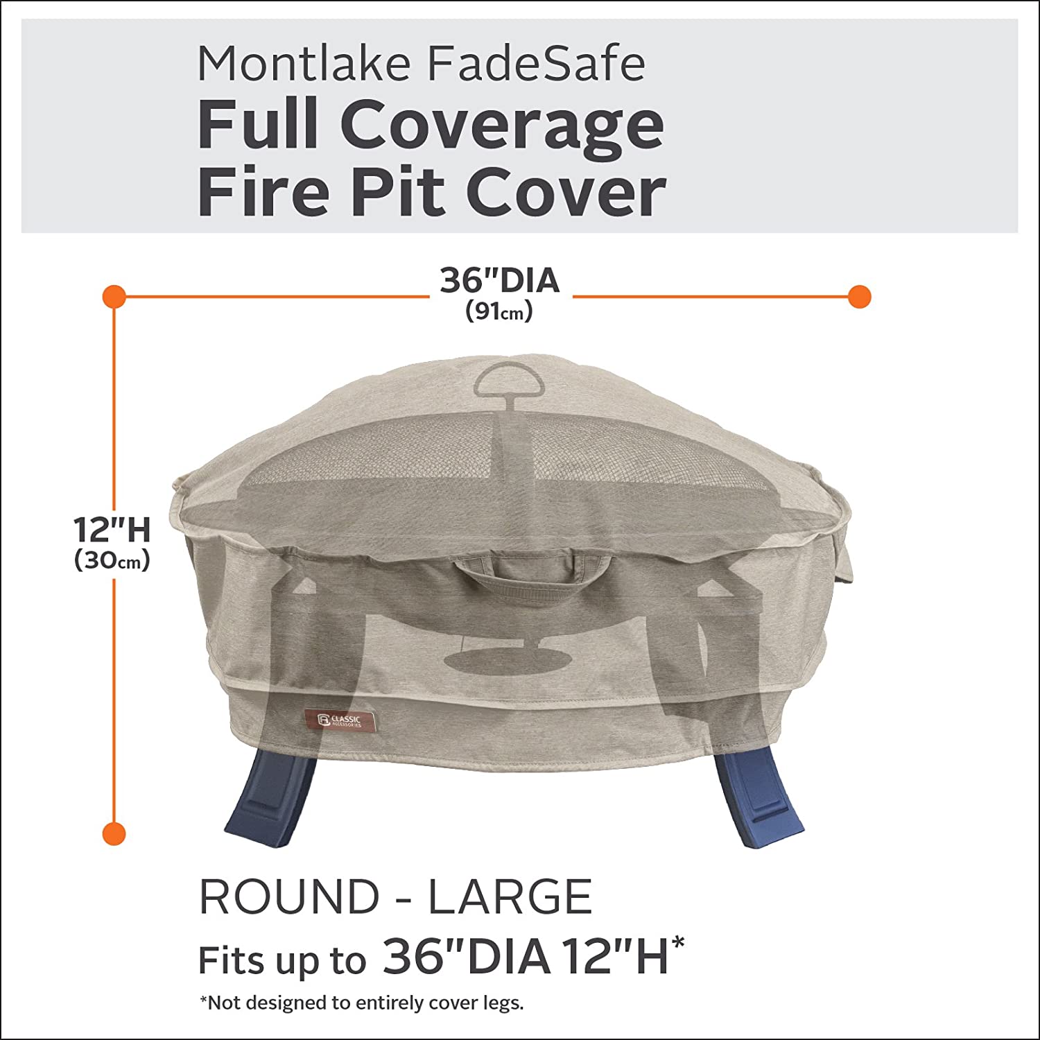 The Montlake patio furniture collection from Classic Accessories has solution dyed fabric that is both stylish and engineered to resist fading. Guaranteed to fit round fire pits up to 36 inches in diameter. Click-close straps snap over legs to secure cover on windy days. Air vents keep weather out while providing maximum ventilation and minimum condensation. Single cord lock closure within specially designed hem tunnels allow easy adjustment resulting in a custom-like fit.
