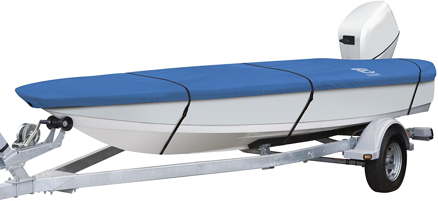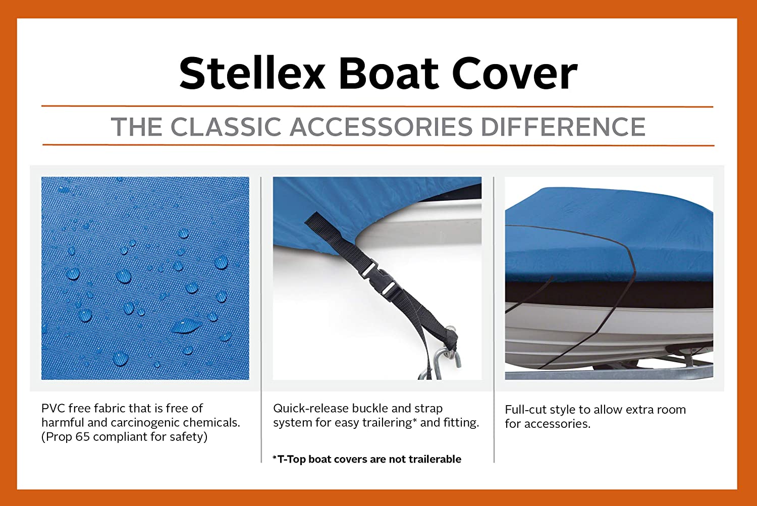 The Stellex Trailerable Boat Cover by Classic Accessories provides superior protection regardless of your climate. Whether you're traveling down the highway or storing at home, you can count on fade-resistant UV protection that lasts. This beautiful cover never takes a season off, and will stand up to sun, rain, snow and wind throughout the year. The full cut cover allows extra room for accessories, while the elastic bottom hem and integrated strap system create a molded and tight fit. Trailering and fitting is easy with quick-release buckles, trailering straps, and the included storage bag. Backed by a four-year hassle-free manufacturer’s warranty. Classic Accessories Stellex Boat Cover, Model A, 20-145-080501-00 Fits 14 to 16 foot long boats with beam widths up to 75 inches, Blue.