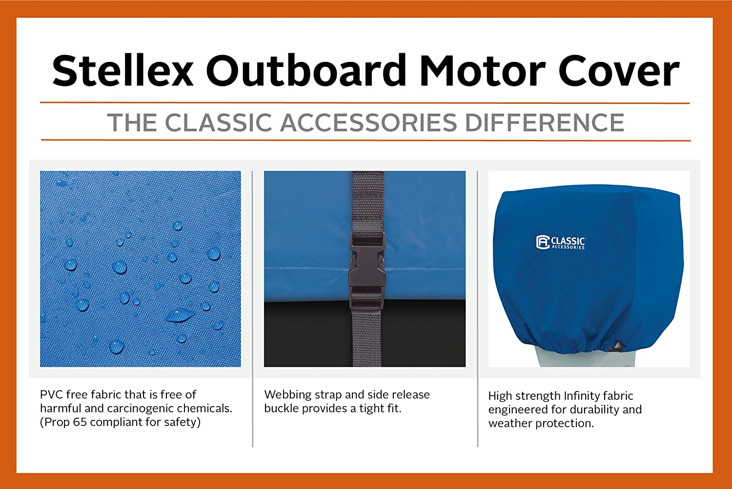 The Classic Accessories Steller trailer able outboard boat motor cover comes in three sizes which fits most outboards with cowlings up to 23" L x 16" W x 17" H (25-50 HP), 24" L x 18" W x 23" H (50-115 HP), 28" L x 18" W x 27" H (115-225 HP). It covers the motor cowling to protect from sun and weather damage. High strength Steller fabric is engineered for extra durability and maximum weather protection. Includes a webbing strap and side release buckle on the hem to cinch cover tightly over the motor. This cover is only for use when motor is not running. Includes a 4 year warranty.