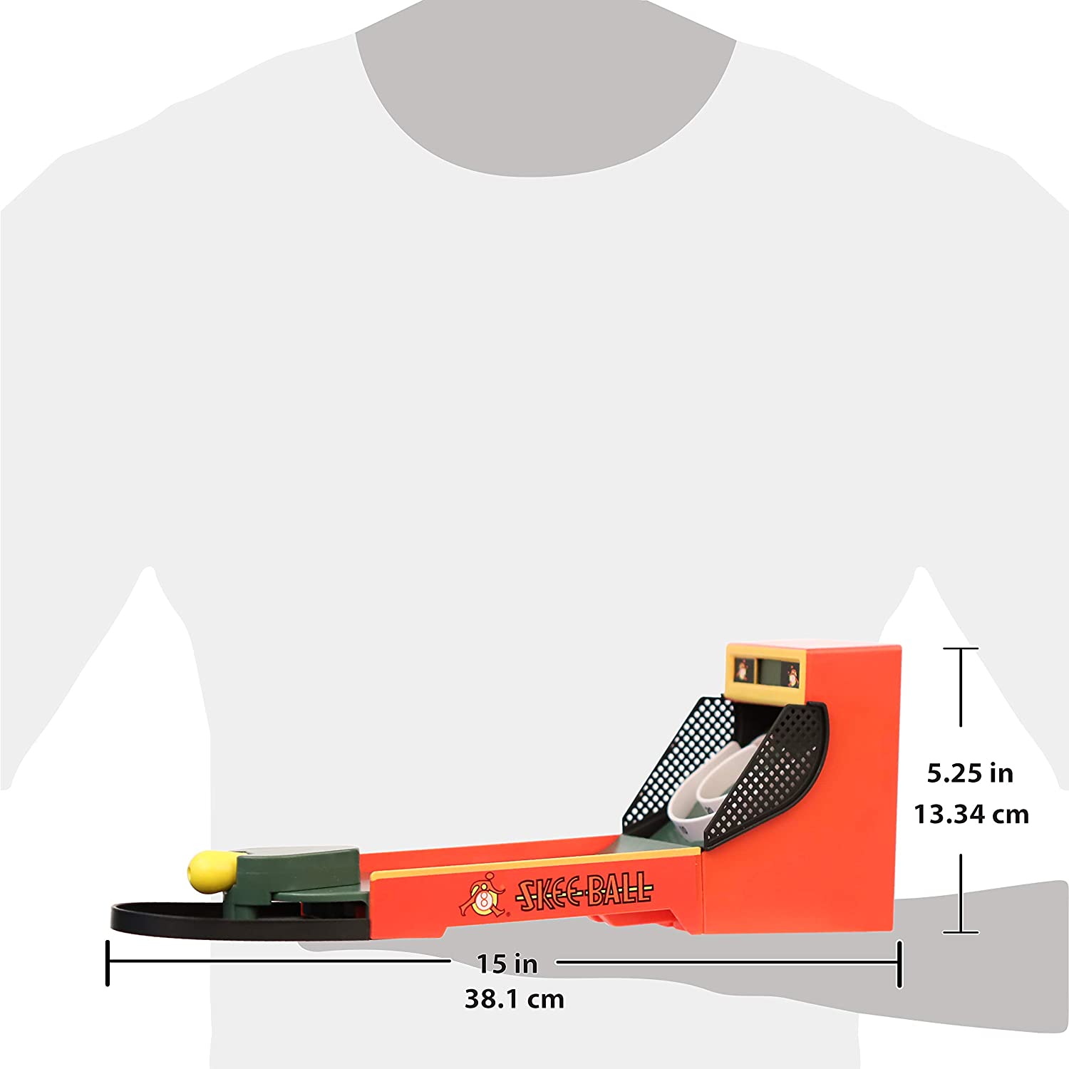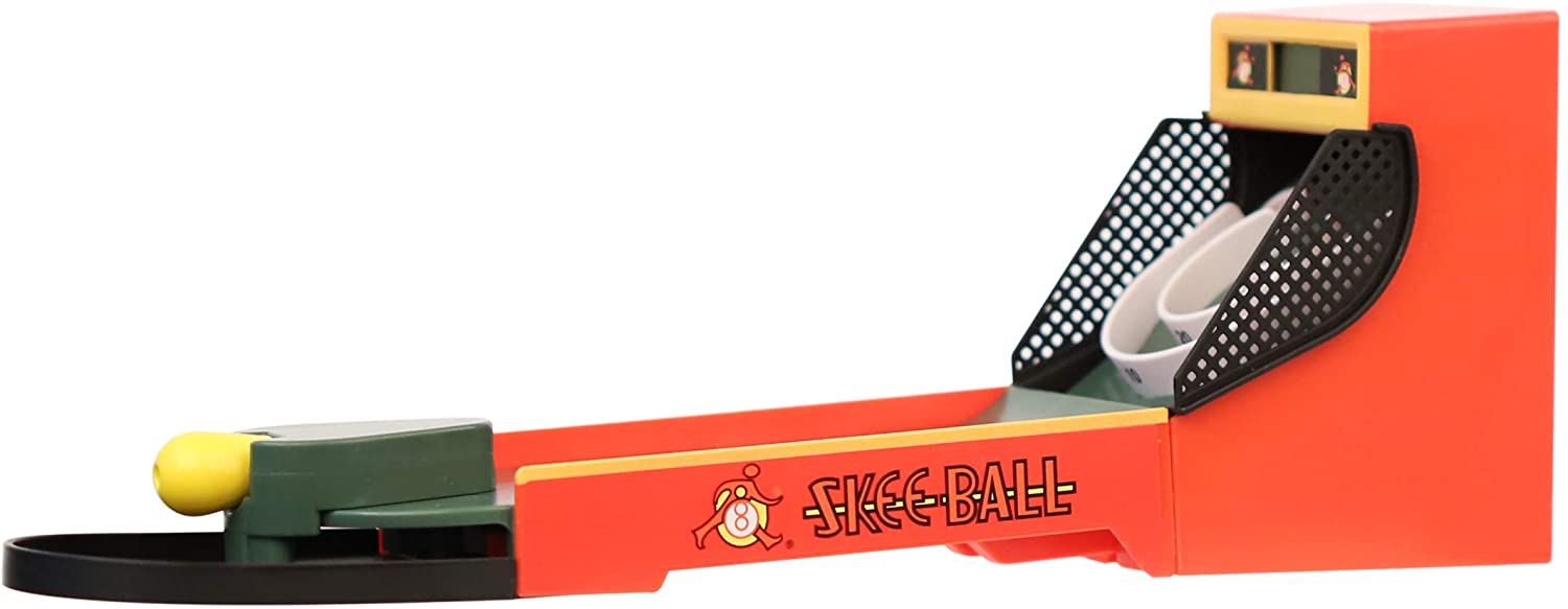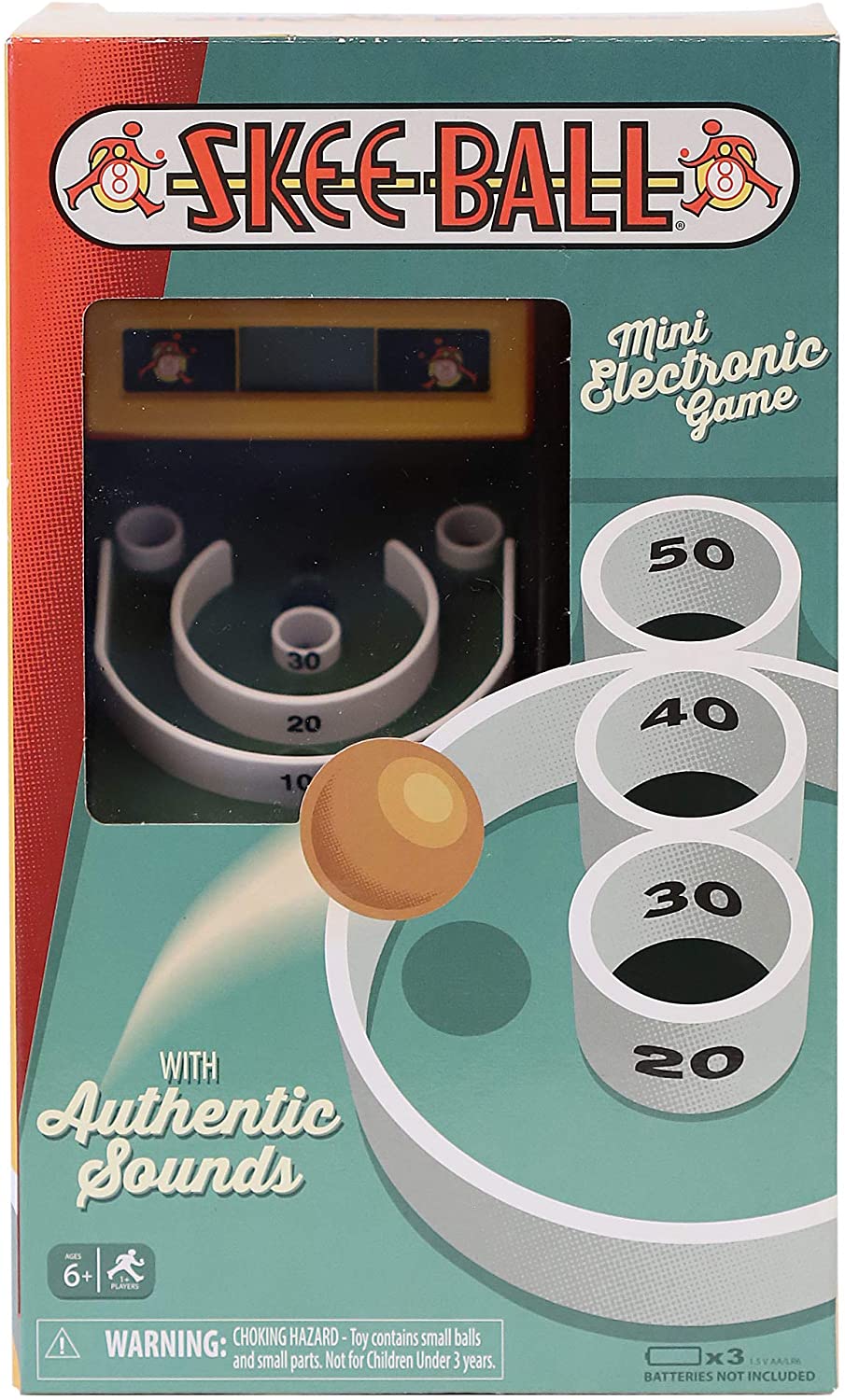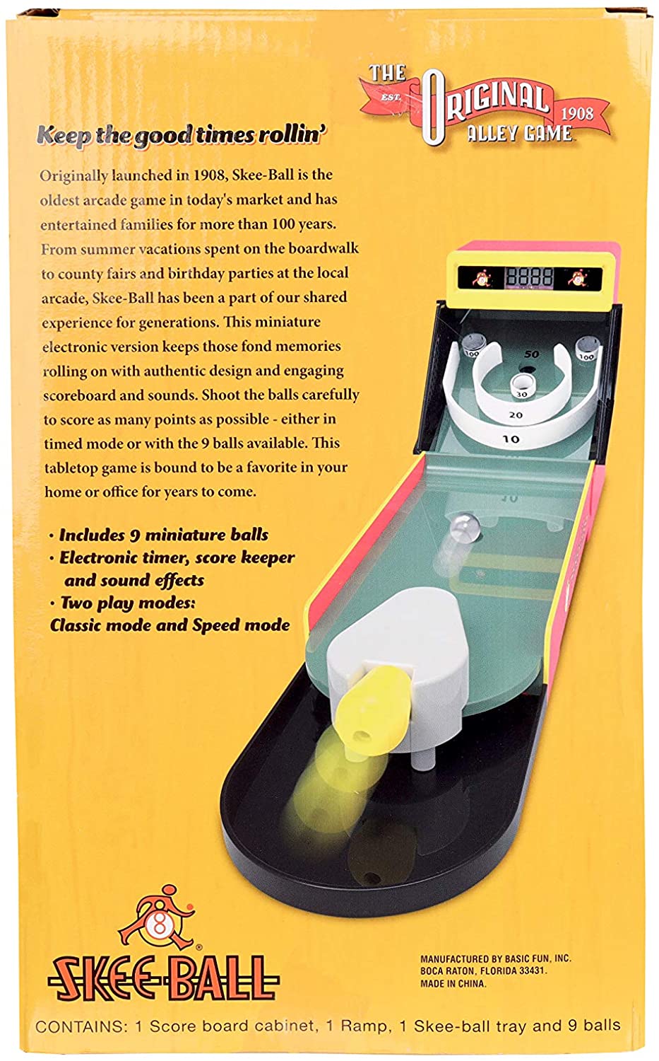 Originally launched in 1908, skee-ball is the oldest arcade game in today's market and has entertained families for more than 100 years. From summer vacations spent on the boardwalk to County fairs and birthday parties at the local arcade, skee-ball has been a part of our shared experience for generations. This miniature electronic version keeps those fond memories rolling on with authentic design and engaging scoreboard and sounds. Shoot the balls carefully to score as many points as possible - either in timed mode or with the 9 balls available. This tabletop game is bound to be a favorite in your home or office for years to come. Includes 9 miniature metal balls, electronic timer, score keeper and sound effects. Game includes small balls that are a CHOKING HAZARD, not intended for children under 4 years of age.